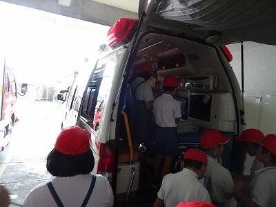 消防署では、消防本部通信指令室のモニターを見ながら説明を聞いたり、救急車の中を見せてもらったりしました。
