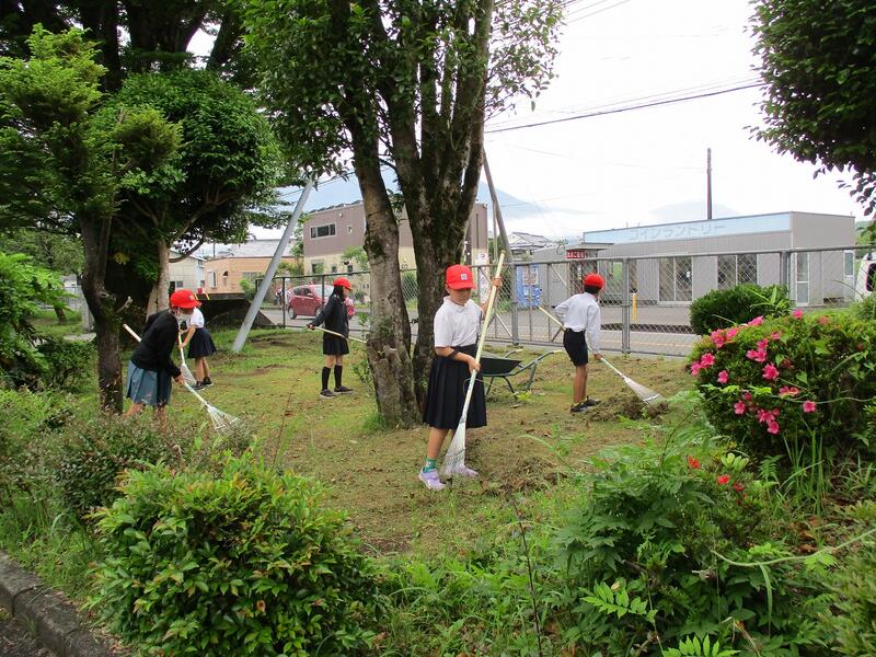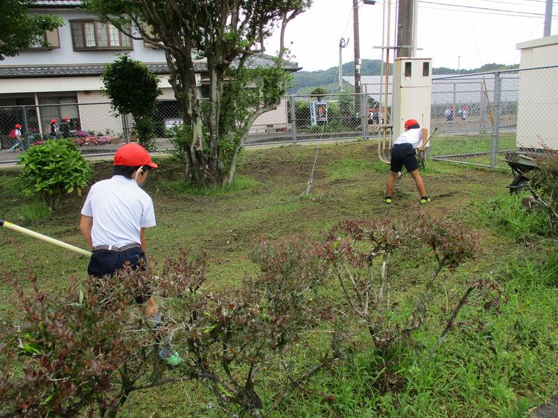 4年生になって、毎朝取り組んでいるボランティア。晴れの日は、草刈りをしてくださったところを中心に草集めをしています。初めの頃は、何も意識していなかった草刈りの音を今では、「あそこの草を刈っているから、明日はあそこですね。」と言う人まででてきました。雨の日は、校内の廊下や階段の掃除をしています。いろいろな先生方から、「ありがとう」とお礼を言われたり、「さすがだね」とほめていただいたりする機会が増え子どもたちも、ますますはりきって頑張っています。