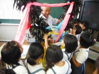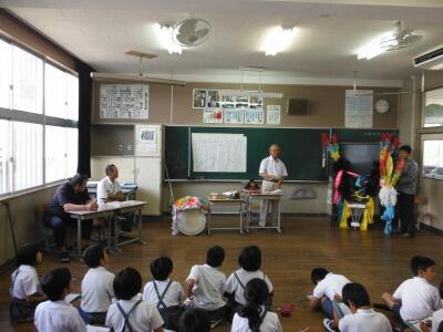7月14日(金)総合的な学習の時間に、細野輪太鼓踊り保存会の方々に来校いただき、細野輪太鼓踊りについて教えていただきました。歴史的な背景を含めた輪太鼓踊りについての説明を聞くだけでなく、実際に道具に触れることもでき、地域を知るきっかけになりました。