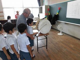 総合的な学習の時間に、細野一区輪太鼓の保存会の方を招いてお話をしていただきました。