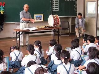 総合的な学習の時間に、細野一区輪太鼓の保存会の方を招いてお話をしていただきました。