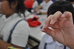 グンゼ工場は、ストッキングを編立から製品・出荷まで全てを作っている工場だそうです。初めに、糸の説明をしてくださいました。原糸は、高崎工場で作られています。工場の説明のなかで一番驚いたのは、編立の機械が520台整然と並んでいて、室内はエアコンで涼しくしてあったところでした。