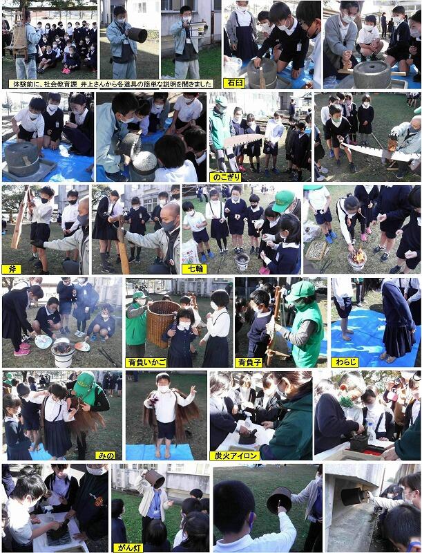 社会科で、昔の道具「石臼、のこぎり、斧、七輪、背負いかご、背負子(しょいこ)、わらじ、みの、炭火アイロン、がん灯」を実際 に使う体験をしました。使い方を教えてくださったのは、小林ガイドボランティアと社会教育課の皆さんです。現代の道具に比べ ると、手間がかかったり、重かったりしますが、子どもたちは、体験を楽しみながら、昔の人の工夫や知恵を学びました。