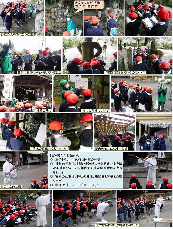 総合的な学習の時間に、地域の伝統文化を学習するために、校区内の「霧島岑神社」の秘密を探りました。小林ガイドボランティアのお二人に案内・説明をしていただきましたが、途中、宮司さんからもお話を聞き、お祭りしてある神様のことや神社の役割などを詳しく知ることができました。この後は、学習したことをパンフレットとしてまとめながら、さらに深めていきます。