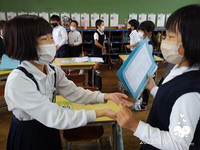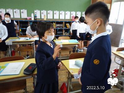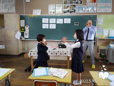 5月は、"How are you?" "I'm fine." "I'm hungry."と様子をたずねる言い方や答え方をジェスチャーを交えながら