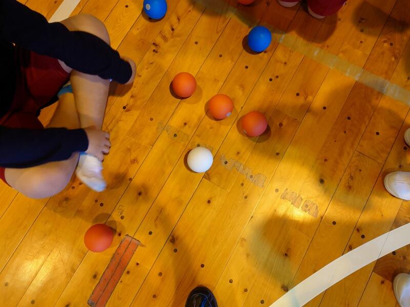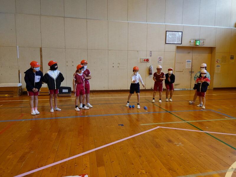ボッチャをするのは初めての3年生。ルールを聞いて練習をしました。ルールはとても簡単でしたが、ジャックボールと呼ばれる白いボールに近づけるように投げることが意外に難しかったようです。だれでも握れるようにやわらかい素材でできたボールは、思ったより重くずっしりしています。それをできるだけジャックボールに近い場所に投げていきますが、思ったようにはいきません。投げたボールがうまく寄せられたり、逆に遠くに行ったりして楽しんでプレイできました。