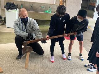 長斧で薪割りを体験しました。斧が重くて、なかなか薪が割れませんでした。