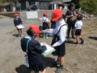 白地図と方位磁針を持って、学校を出発。簡易郵便局や駐在所、細野中学校などを確認し、国道から中の道へ入っていきました。住宅地や田畑、茶畑、茶工場など、道の両側が何に使われているかを白地図にかき込みながら進みました。ふだん何気なく通っている道でも、目的をもって歩くと色々な発見をすることができたようです。