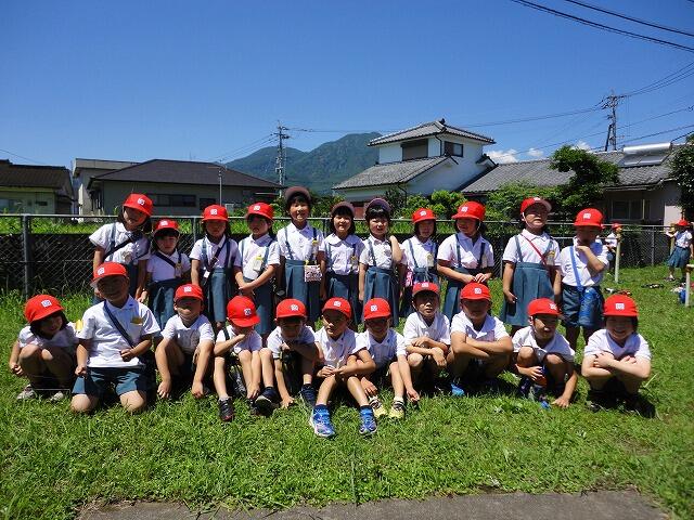 6月23日(火)の生活科の時間に、学校の周辺を歩きました。小学校の正門前の横断歩道を渡り、郵便局前、牧場の桜並木、細野駐在所、細野中学校、地区体育館前を通り、運動場側の門に帰ってきました。桜並木にある公園(子どもたちが三角公園と呼んでいます)で少し遊び、記念写真を撮りました。田植えのすんでいる田んぼや紫陽花やグラジオラスの咲いている様子など季節の変化に気付くことや「この道、初めて通った。」と喜ぶ声も聞かれました。