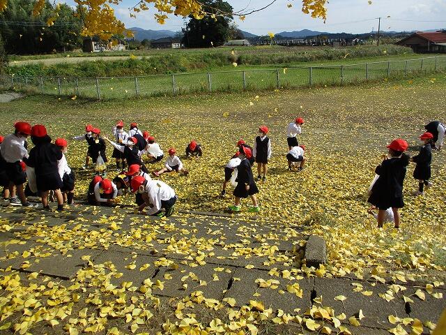学校でも25日に、生活科の時間に校内で秋探しをしました。子ども達がイチョウの葉っぱを拾っているところに、風が吹いてきてイチョウの葉っぱが降ってきました。子ども達は大喜びでした。