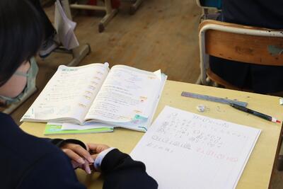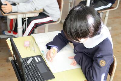 5年生は、算数の時間でした。いつも以上に集中して、ノートにしっかりと問題を解いています。机の上には教科書とノート、そしてタブレットも活用しながら、答えを導き出す姿がとても頼もしいです。