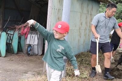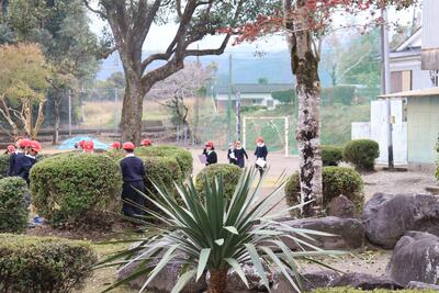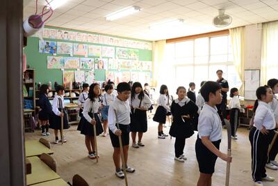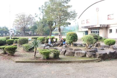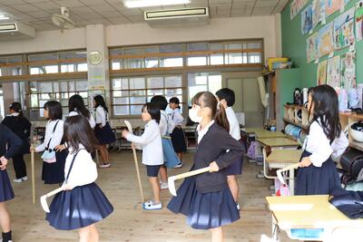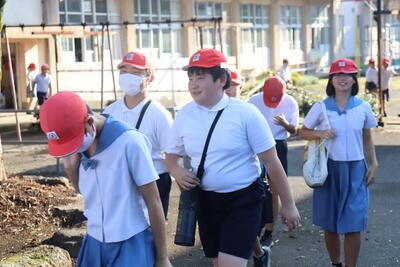 朝はボランティアの姿を見ることができます。写真は、1年生と3年生!友達と協力しながら清掃に取り組んでいました。