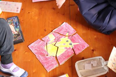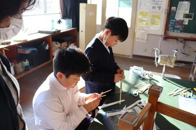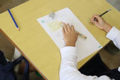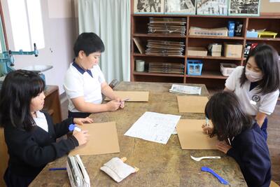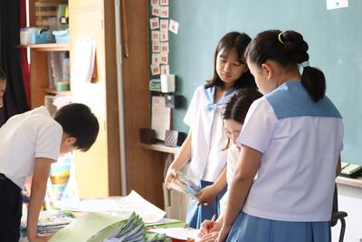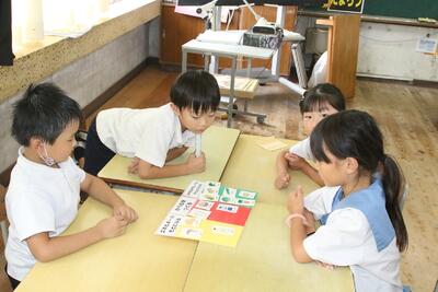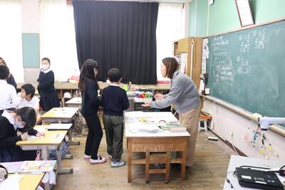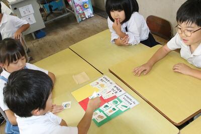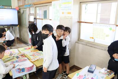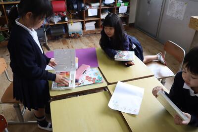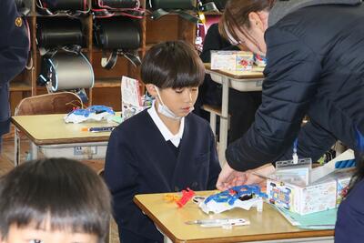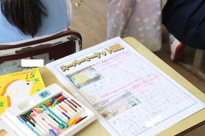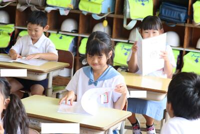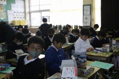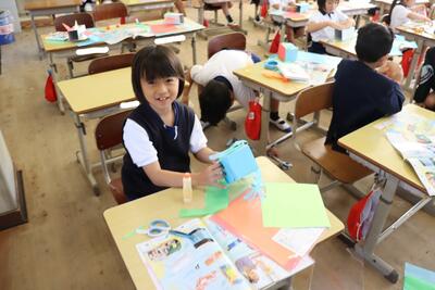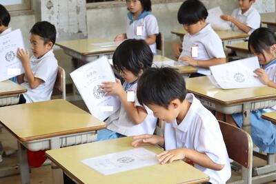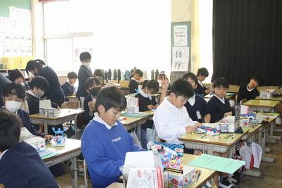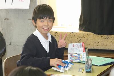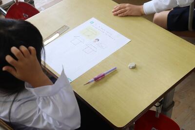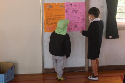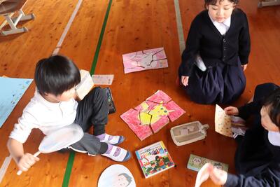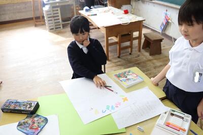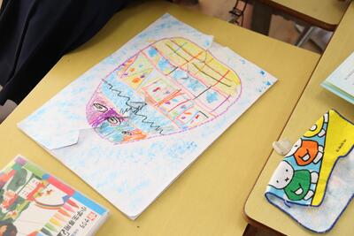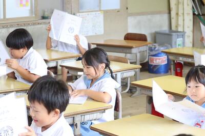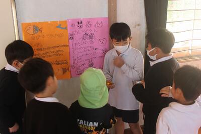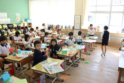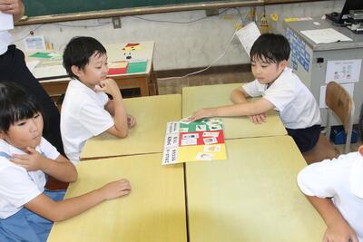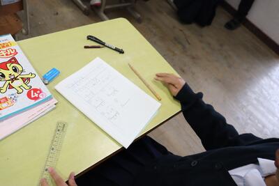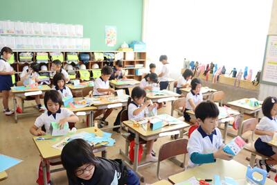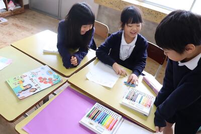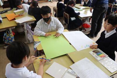 もうすぐ開催される「おもちゃ祭り」に向けて、2年生が準備を進めています。この日は、幼稚園のみなさんを招待するために、グループごとにアイデアを出し合いました。机の上には色とりどりの画用紙やクレヨン、色鉛筆が並び、どのグループも真剣な表情で作業中。「どうしたら幼稚園の子が楽しめるかな?」と相談しながら、ゲームのルールや景品の工夫を考える姿がとても頼もしいです。準備の中には、絵を描く係、文字を書く係、材料をそろえる係など役割分担もばっちり。教室は、まるで小さな工房のようなにぎやかさでした。