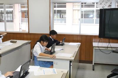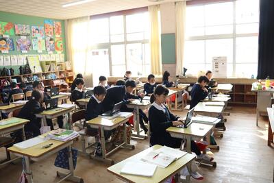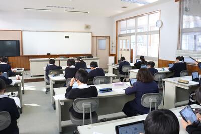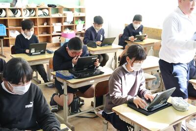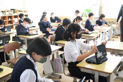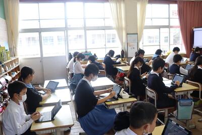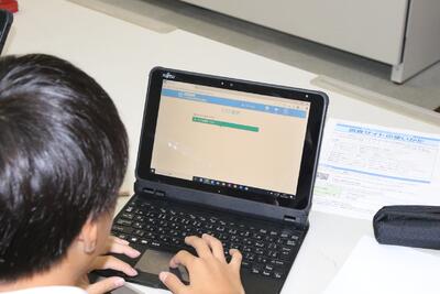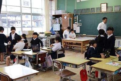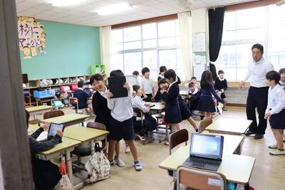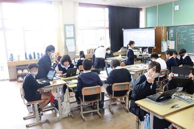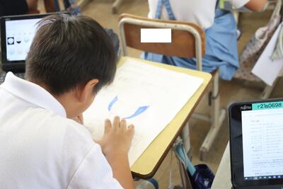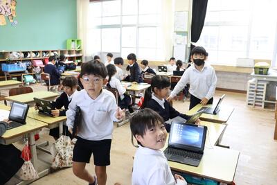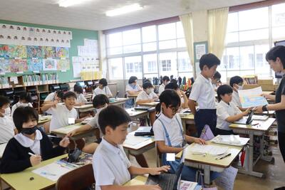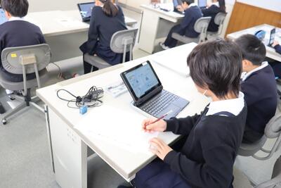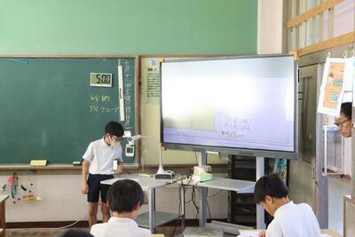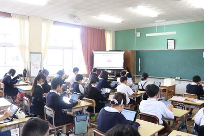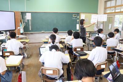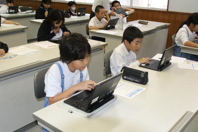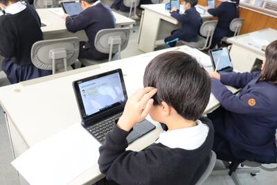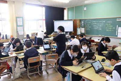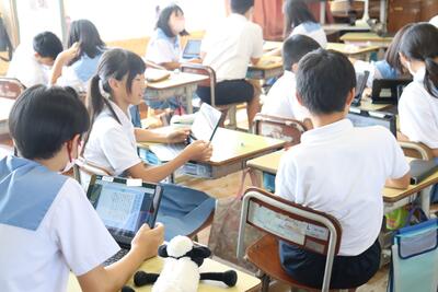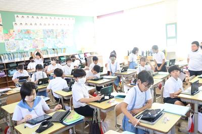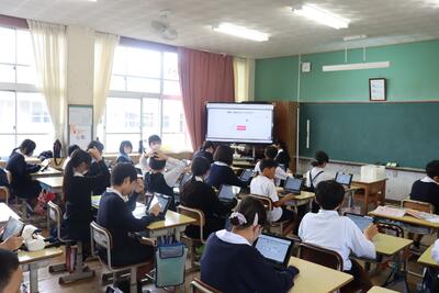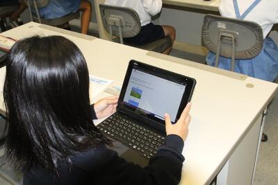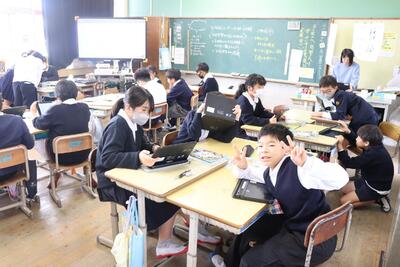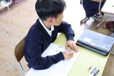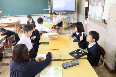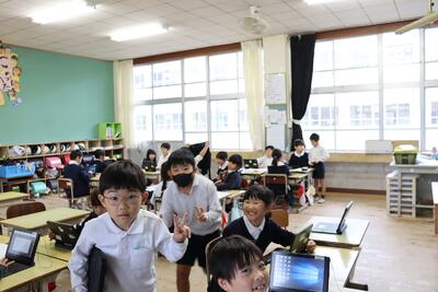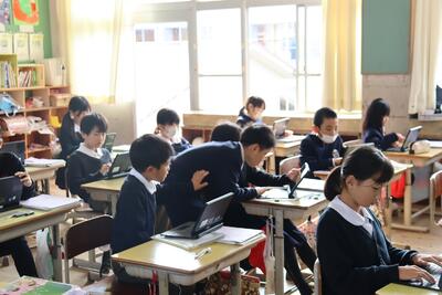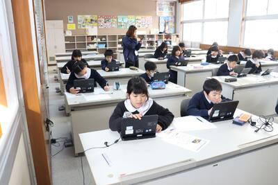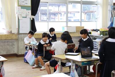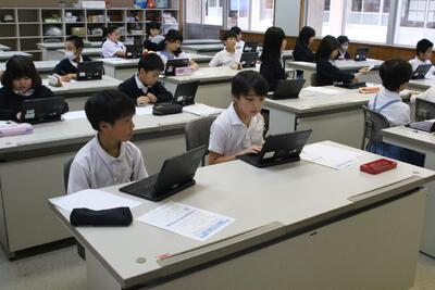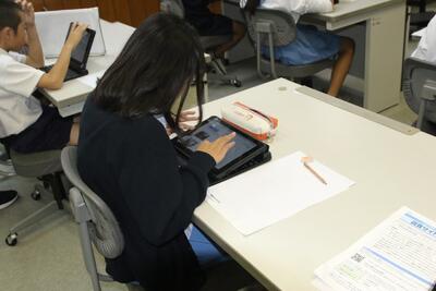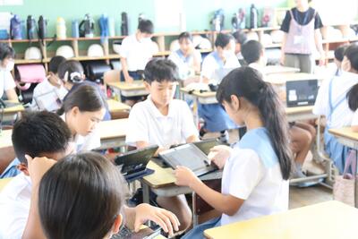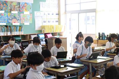 4年生の理科の授業では、これまで学んだ内容をタブレットを使ってまとめ学習をしています。一人ひとりが集中して画面に向かい、時には友達と相談しながら進める姿がとても印象的です。
