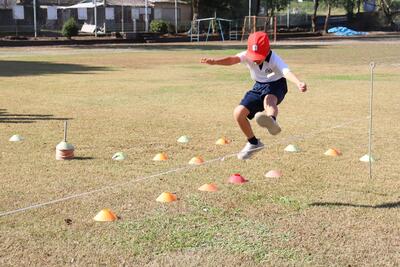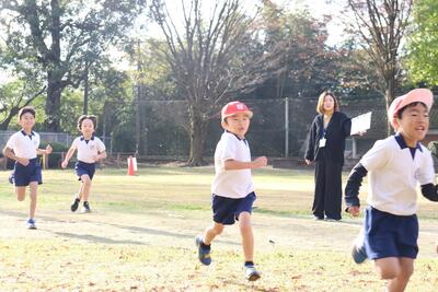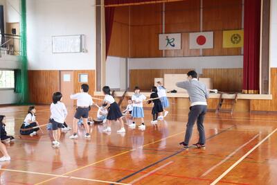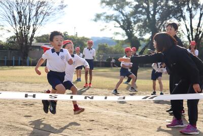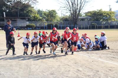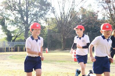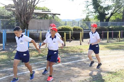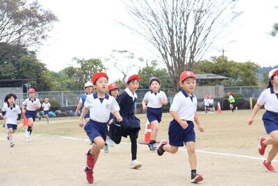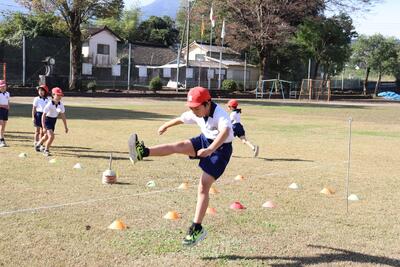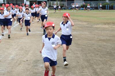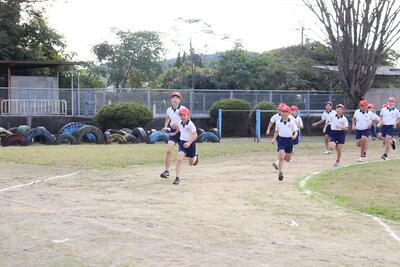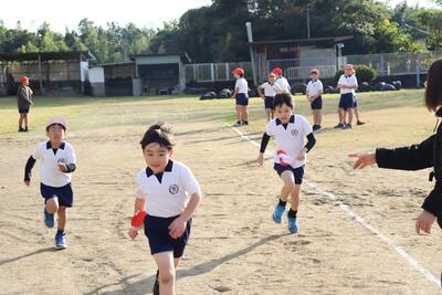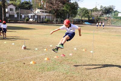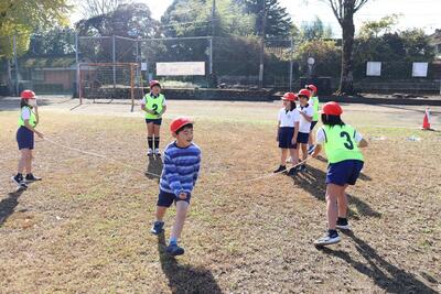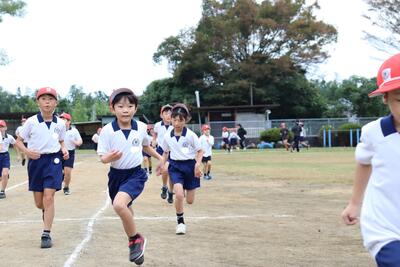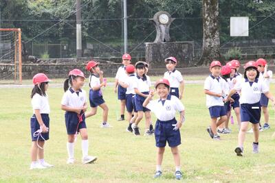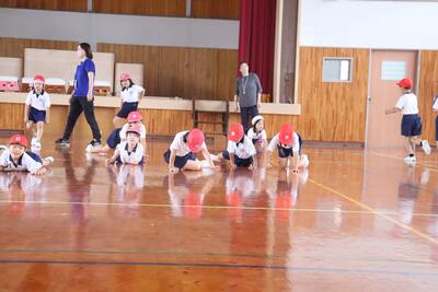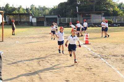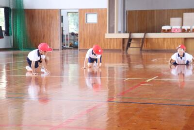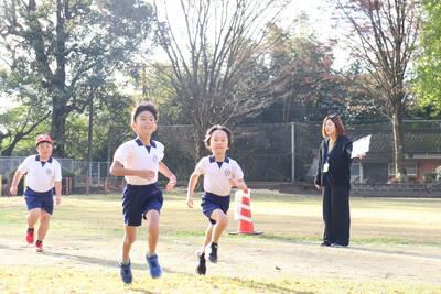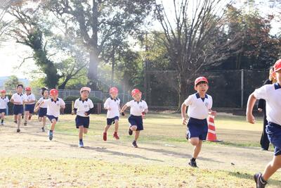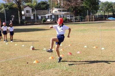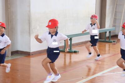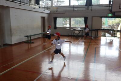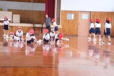1年生の体育です。手をついて前に進む運動や、全力で走る練習にチャレンジ!みんな汗びっしょりになりながらも、笑顔でがんばっていました。