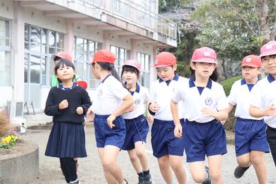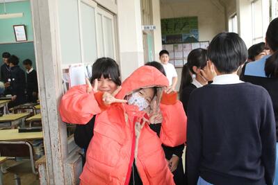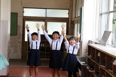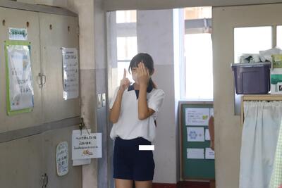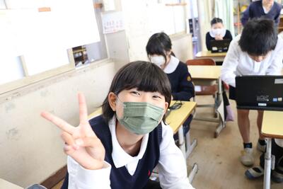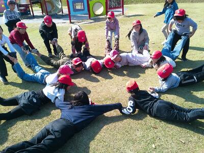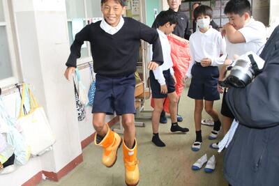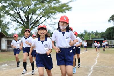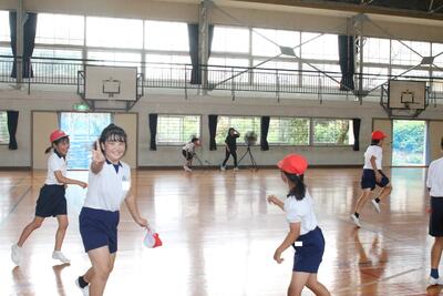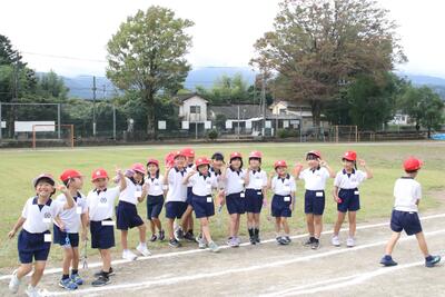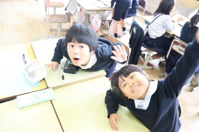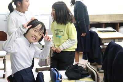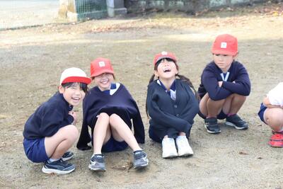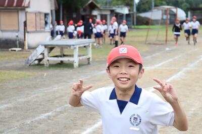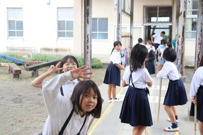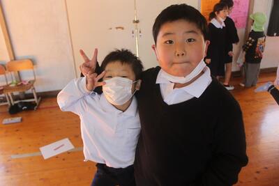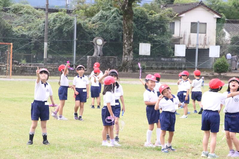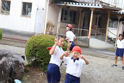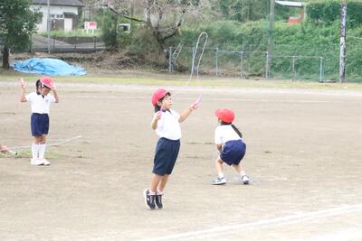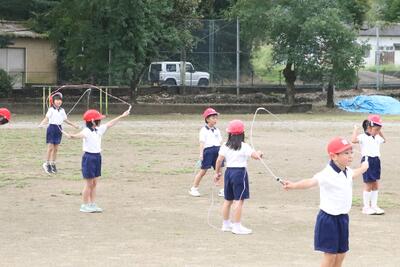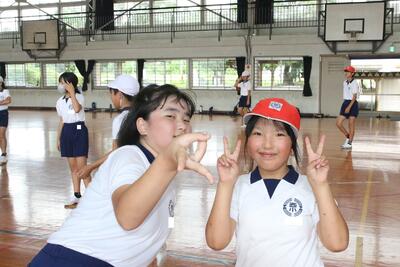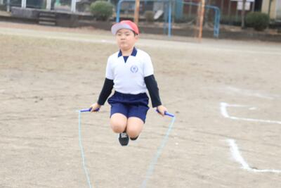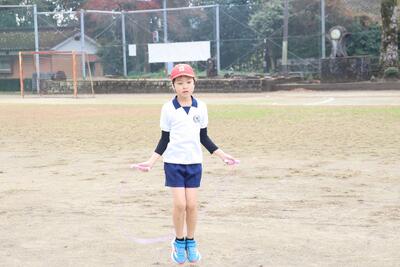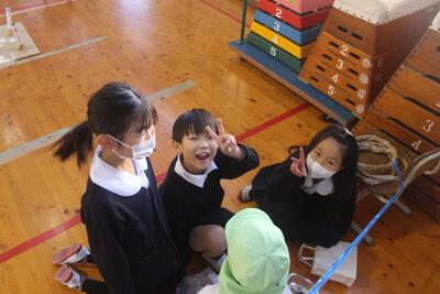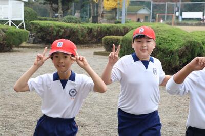 1年生は体育で縄跳びの練習でした。授業前に運動場に早めに集まってきた1年生が、カメラの前でポーズを取ってくれました。