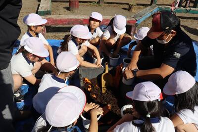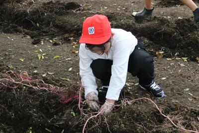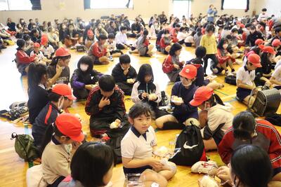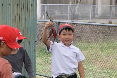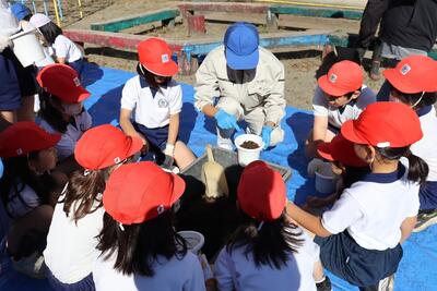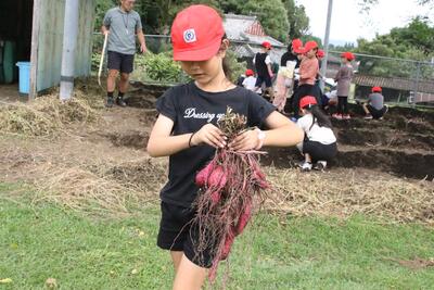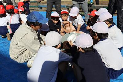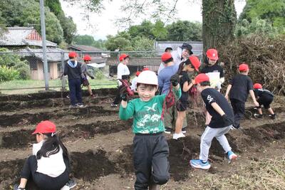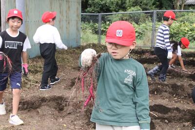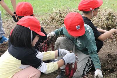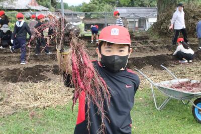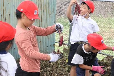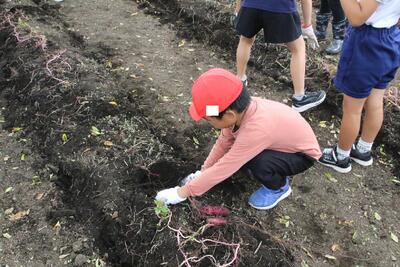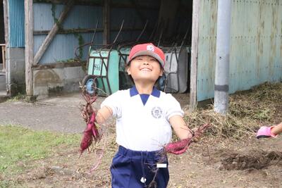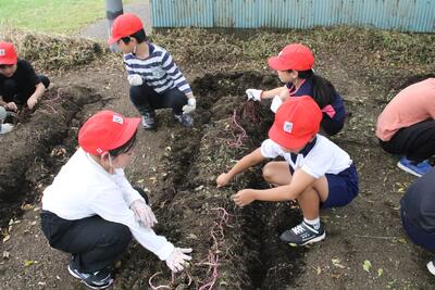 今日は、2年生が畑で芋ほりにチャレンジしました!赤い帽子に軍手をつけて、みんな一生けんめい土を掘る姿がとっても頼もしい!「見て見て!とれたよ!」と、うれしそうにサツマイモを掲げる笑顔がいっぱいでした。友だちと協力して掘ったり、先生と一緒に収穫したり、秋の自然をたっぷり感じる楽しい時間になりました。