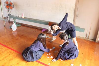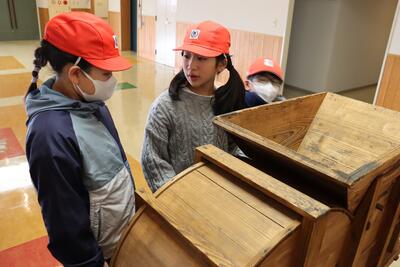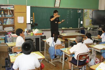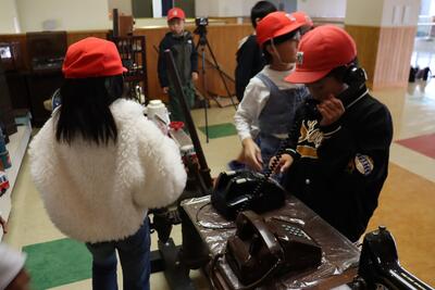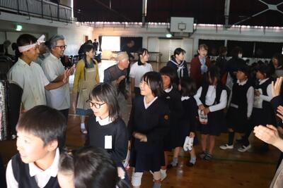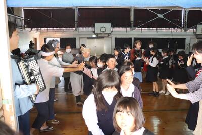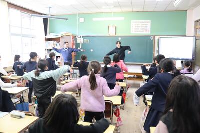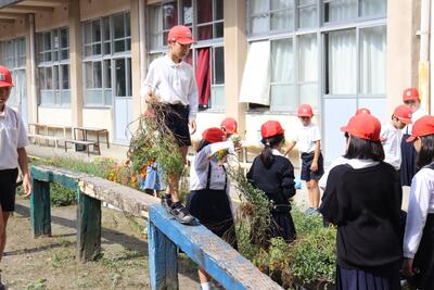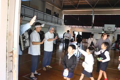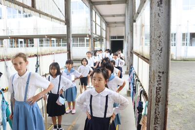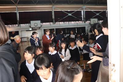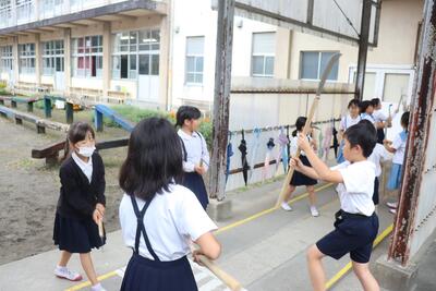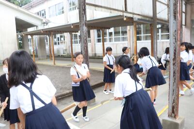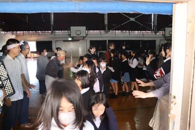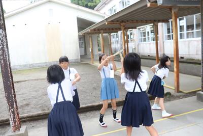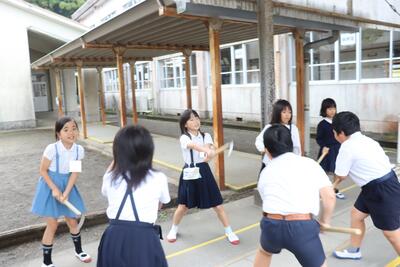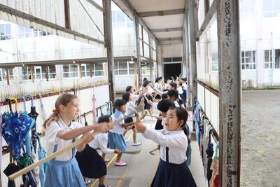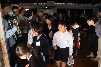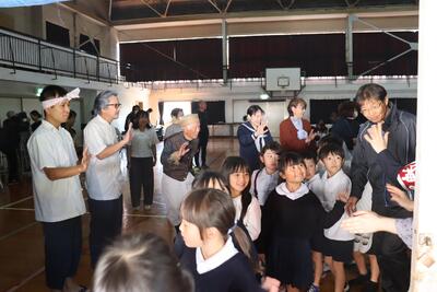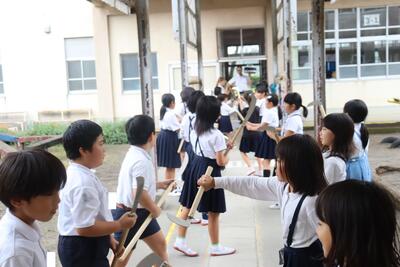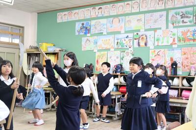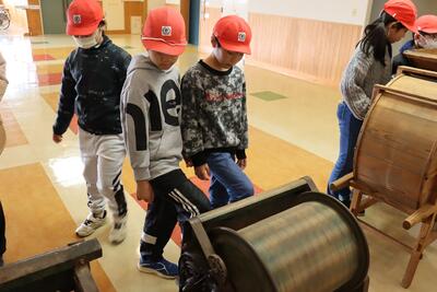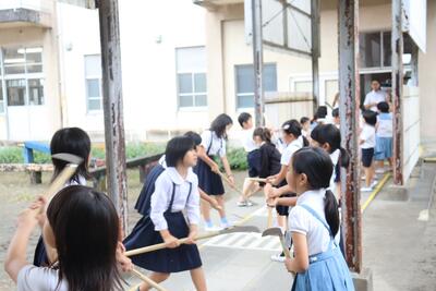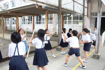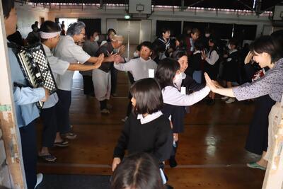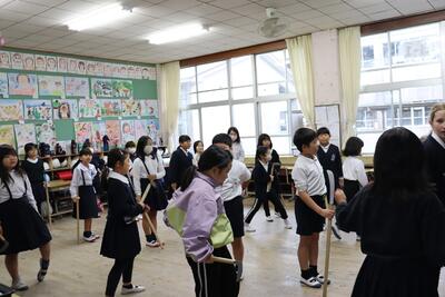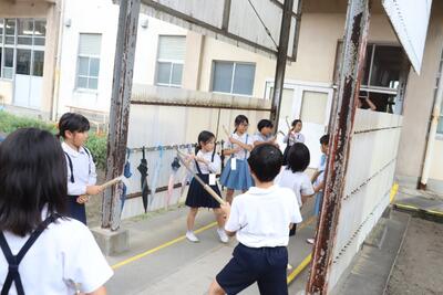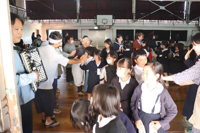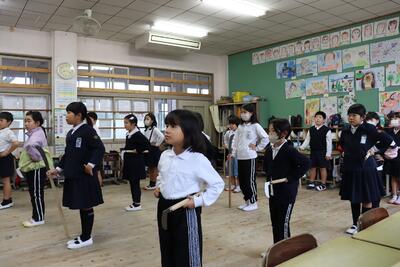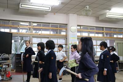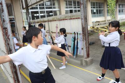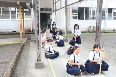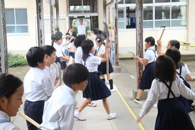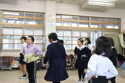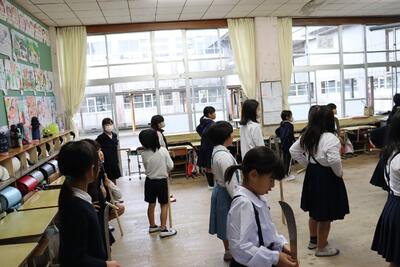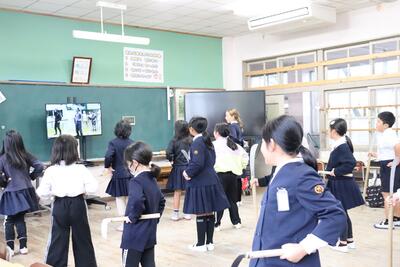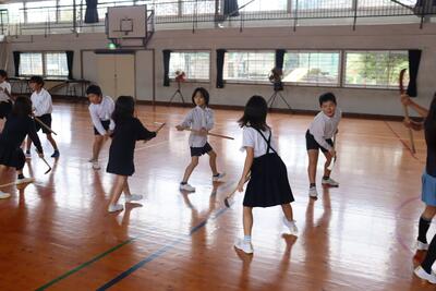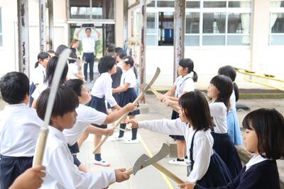 3年生が、地域に伝わる伝統芸能「鎌之手踊り」の練習を行いました!なんと、練習場所は学校の廊下!今日は踊りのステージに早変わりです。手に持った鎌をリズムよく振りながら、ペアで息を合わせて踊る姿はとっても真剣。「右?左?あれ、どっちだっけ?」と戸惑いながらも、先生のアドバイスを受けて、少しずつ動きが揃ってきました。途中の休憩では、笑顔でおしゃべりしながらも「次はもっと上手に踊るぞ!」とやる気満々。地域の伝統を受け継ぐ大切な時間となりました。