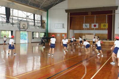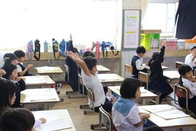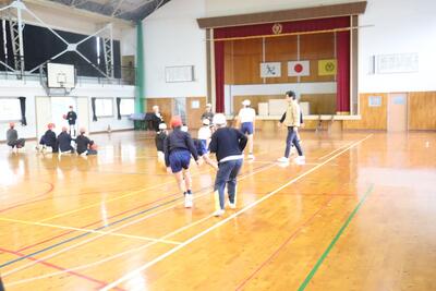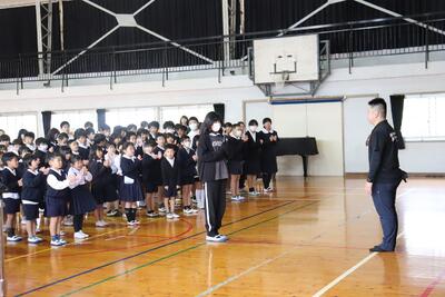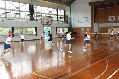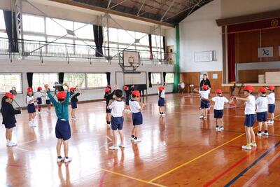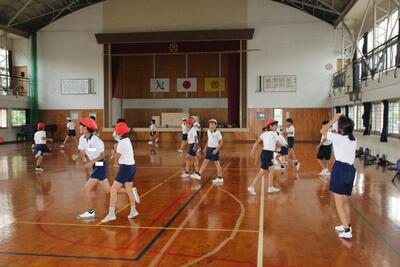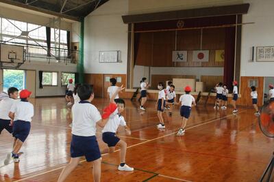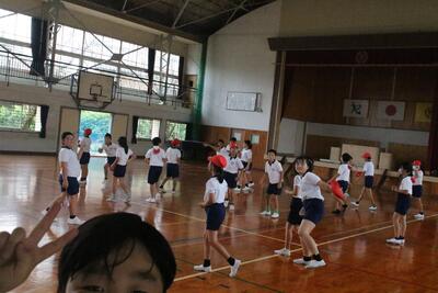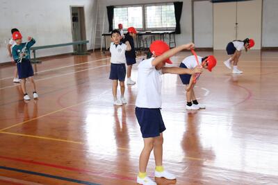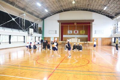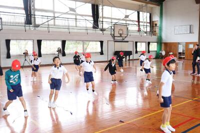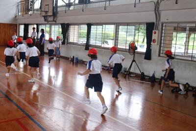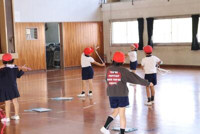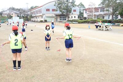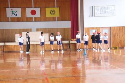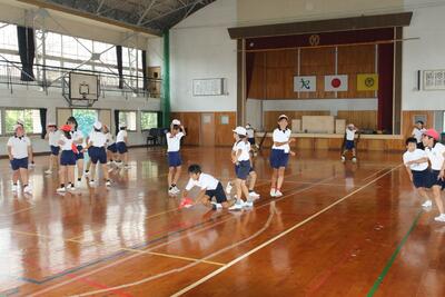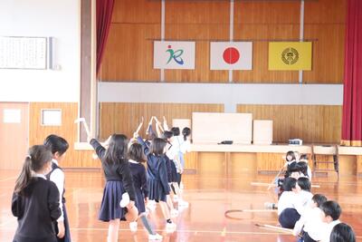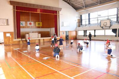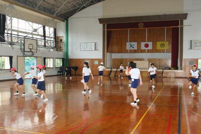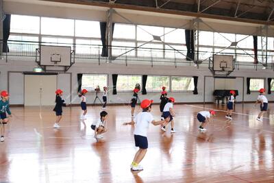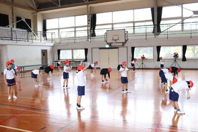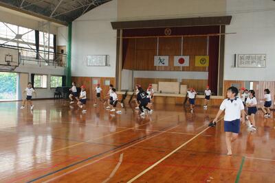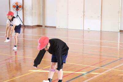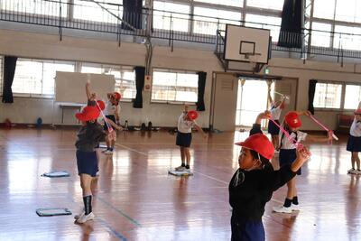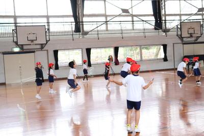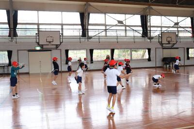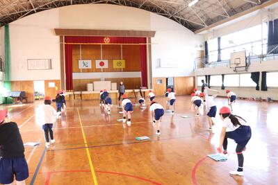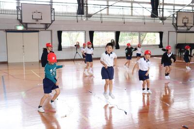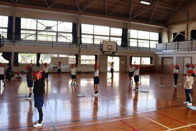 体育館で1年生がなわとびの練習をしました。始める前には、しっかりと体操をして体をほぐします。腕を大きく回したり、足を伸ばしたり、準備運動も丁寧に行っていました。寒い季節でも体をしっかり動かし、元気いっぱいの時間になりました。