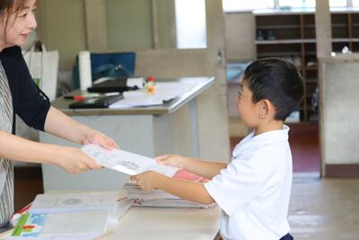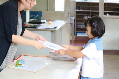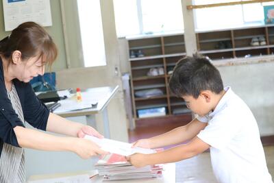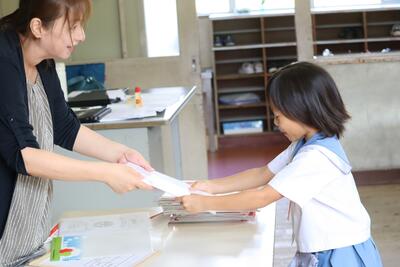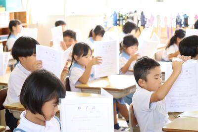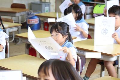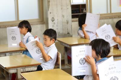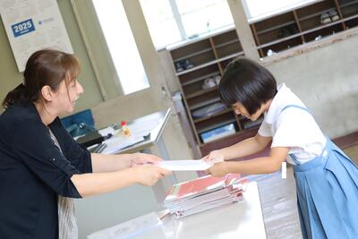 今日は1年生にとって、ちょっぴり特別な日。小学校生活で初めての通知表を受け取る日です。教室では、緊張した表情や、ちょっと照れくさそうな笑顔があふれていました。先生から一人ひとりに手渡される通知表。そっと開いて中を見つめる姿は、どの子も真剣そのもの。1学期間、毎日コツコツと頑張ってきたことが、ぎゅっと詰まった一枚。