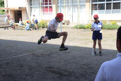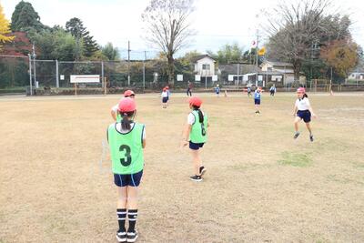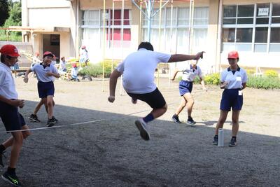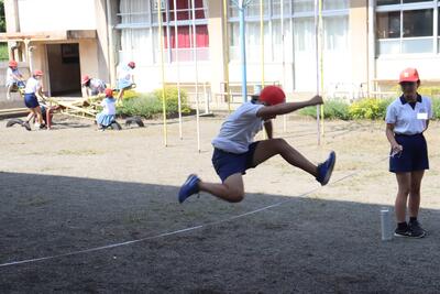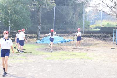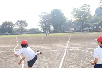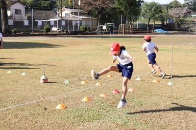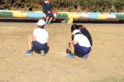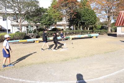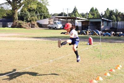 3年生の体育です。ゴムを使った高跳びでは、勢いよく踏み切り、体を大きく伸ばして跳び越える姿がとても力強いです。列に並んで順番を待つ子どもたちも、仲間の跳躍を見守りながら「次は自分の番!」と集中。走り出すスピード、踏み切りのタイミング、そして空中でのバランス――一つひとつに工夫が見られます。青空の下で体を動かす楽しさと、挑戦する気持ちがあふれる時間でした。