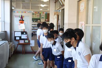 今日は、5,6年生の身体計測と視力検査がありました。廊下にはハロウィンの飾りが並び、ちょっとしたお祭り気分…と思いきや、子どもたちは真剣そのもの。なぜなら、あの「C」の向きが、なかなかの難敵だからです。「えーっと…右?いや、下?…やっぱり左?」そんな声が聞こえてきそうなほど、みんな集中して検査に臨んでいました。片目を覆って、指差す姿はまるで忍者の修行のようでした。視力は、黒板の文字を読むためにも、友達の笑顔を見るためにも大切な力。これからも、みんなの「見る力」を大事にしていきたいですね!