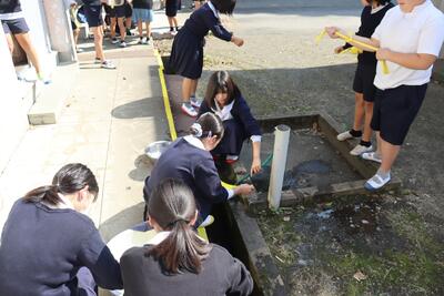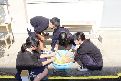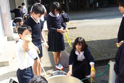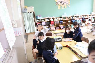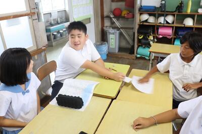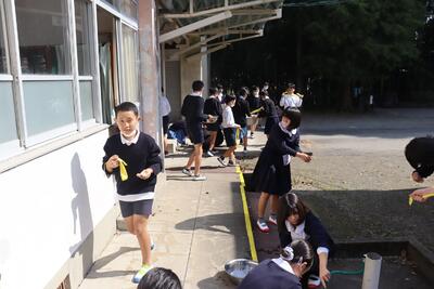 6年生は自分たちの力でさまざまな活動に取り組みました!まずは、陸上大会で使用するハチマキの洗濯。外に出て、青いタライやバケツを使いながら、みんなで協力してゴシゴシと手洗いしました。汚れを落とす作業は大変でしたが、声をかけ合いながら楽しそうに取り組む姿が印象的でした。そして職員室では、修学旅行に向けてのお昼ご飯の予約。電話を使って、実際にお店に連絡を取るという初めての体験に、少し緊張した様子も見られました。「ちゃんと伝えられるかな…」と不安そうな表情もありましたが、仲間と一緒に確認しながら、無事に予約完了!自分たちで準備を進めることで、修学旅行への期待もさらに高まっているようです。今日の活動を通して、責任感や協力する力がぐんと育った6年生。これからの行事でも、頼もしい姿をたくさん見せてくれることでしょう!