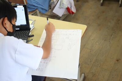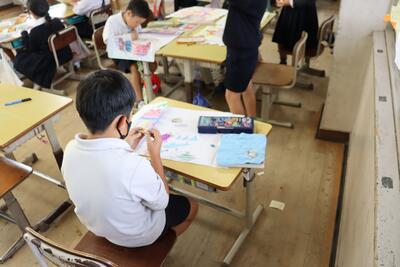 5年生はポスター作りに取り組みました。伝えたいことをまとめたり、イラストや文字で工夫して表現したりと、みんな真剣な表情で作業していました。教室は静かだけど熱気にあふれていました。パソコンを使って調べたり、先生にアドバイスをもらったりしながら、みんな自分らしい作品づくりに挑戦しました。