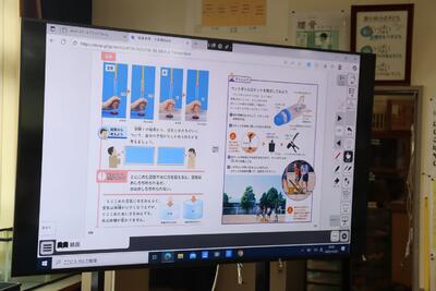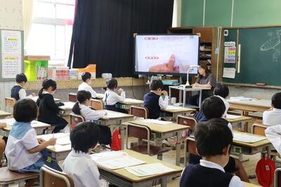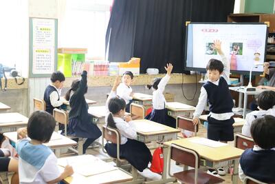 今日は、1年生のこすもす科の中で「うわぐつの洗い方」について学習しました。教室では、先生がスクリーンを使って、うわぐつの洗い方をわかりやすく説明。子どもたちは興味津々で話を聞き、手を挙げて質問したり、自分の考えを発表したりと、積極的な姿が見られました。