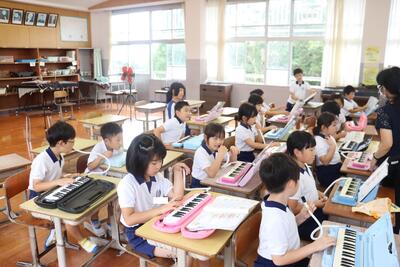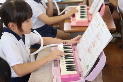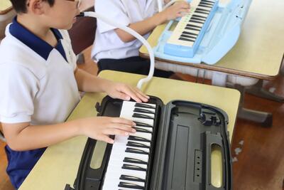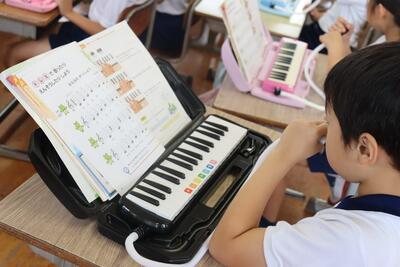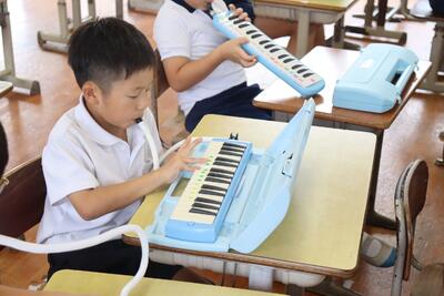 今日は鍵盤ハーモニカで「カエルの歌」を練習しました!色とりどりの鍵盤ハーモニカを手に、みんな一生懸命に音を合わせて演奏。今回はなんと、輪唱(輪奏!?)にもチャレンジ!「せーの!」の合図で、グループごとにタイミングをずらして演奏すると…教室いっぱいに楽しいハーモニーが広がりました。ちょっとむずかしかったけど、みんなで頑張りました。