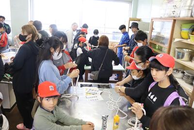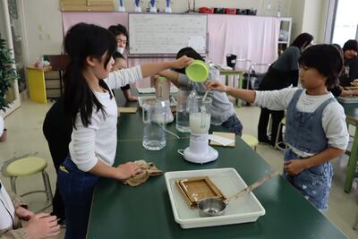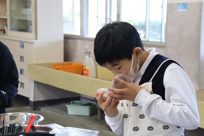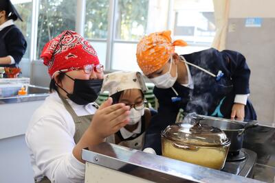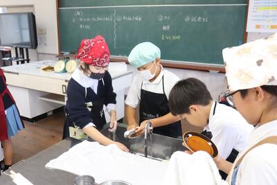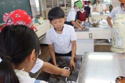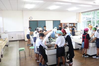今日は5年生が、自分たちで育てたお米を使って「どう炊けるか?」の実験に挑戦しました!なんと、全班で同じ分量の水を使ったはずなのに・・・・。水の量を“なぜか”間違えた班からは、見事なおこげが誕生!炊き上がったお米は、みんなで一口ずつ味見。そして、食べたら片付け!エプロン姿でシンクに向かい、鍋や食器を洗う姿はまるで小さな料理人たち。調理台もピカピカにして、教室はすっかり元通りになりました。
