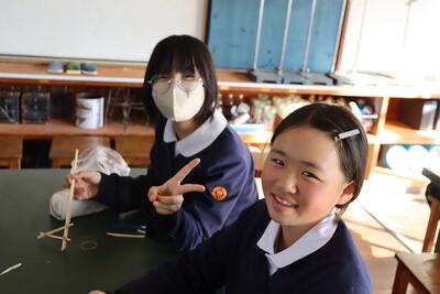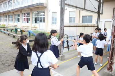 昼休み、6年生が中庭でゴム飛び大会。両足そろえてピョン!片足でヒョイ!リズムに乗って、昭和スタイル全開! 赤い帽子が跳ねるたび、先生たちの記憶もタイムスリップ!?「昔やったなぁ…」なんて声も聞こえてきそう。令和の子どもたちが、昭和の遊びに夢中になる昼休み。懐かしさと新鮮さが混ざった、ちょっと不思議で楽しい時間でした。