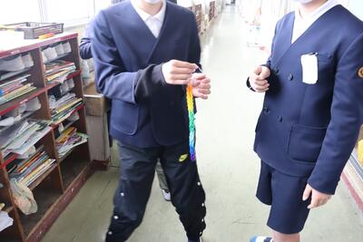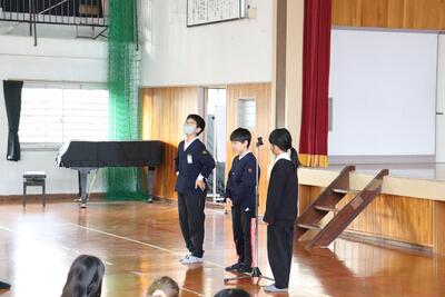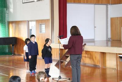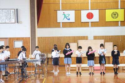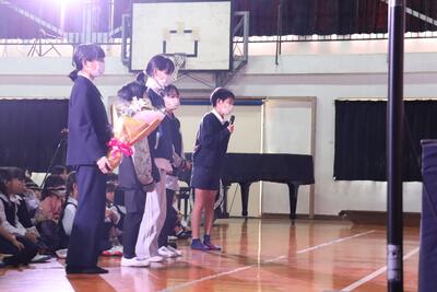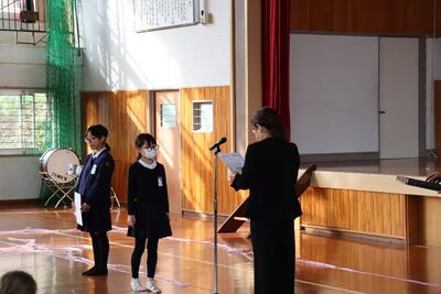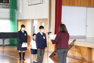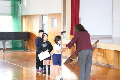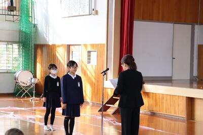 今日は体育館で全校集会が行われました。集会の中で、5年生から嬉しいプレゼントがありました。5年生は、これまで取り組んできたお米販売の収益を活用し、各学年にボールを贈呈しました。自分たちの活動が学校全体の楽しみにつながるという素晴らしい発表に、会場は温かい拍手で包まれました。さらに、集会ではたくさんの表彰も行われました。学習や運動、様々な活動で頑張った児童たちが、賞状を受け取る姿はとても誇らしげでした。一人ひとりの努力が認められる瞬間は、見ている側も胸が熱くなります。今回の集会は、子どもたちの成長や思いやりを感じられる時間となりました。これからも、みんなで力を合わせて楽しい学校生活をつくっていきましょう!