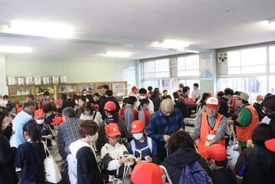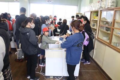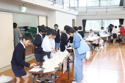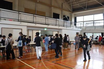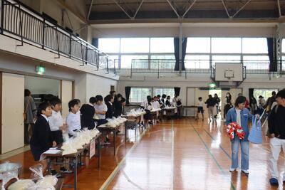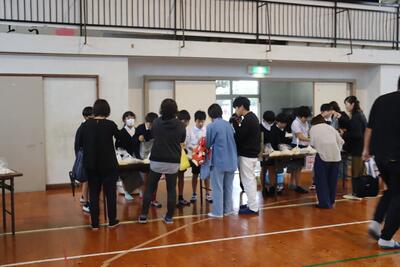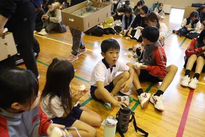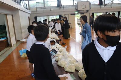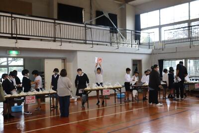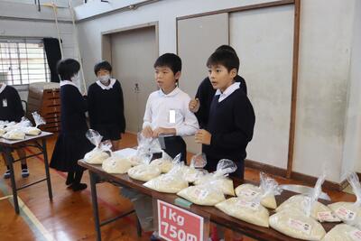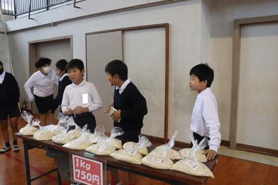 5年生は収穫したお米の販売を行いました。体育館には販売ブースが並び、保護者方々が訪れて、子どもたちとの交流を楽しむ姿が見られました。販売にあたっては、児童たちが現在のお米の価格を調べ、話し合いながら「1kg 750円」といった値段設定を行いました。袋詰めやラベル作成も自分たちで行い、準備から販売までを一貫して体験しました。この活動を通して、農業の大切さや経済の仕組み、そして人との関わりの楽しさを学ぶことができたようです。5年生にとって、実りある貴重な経験となりました。11月1日に行われるPTA主催の「けやき祭り」でもお米の販売をします。(数量限定です。)