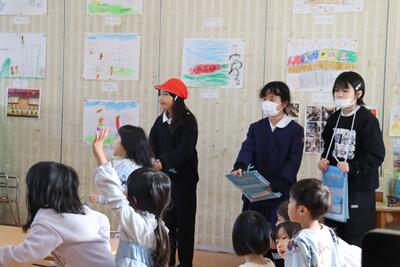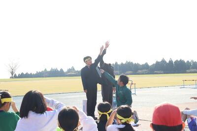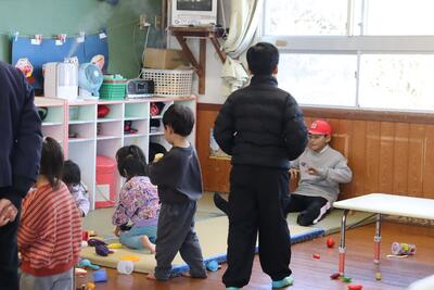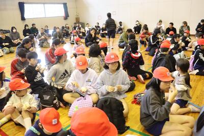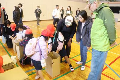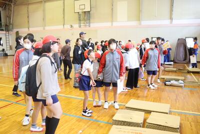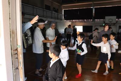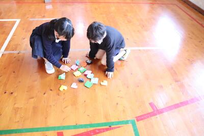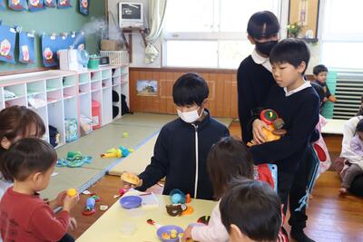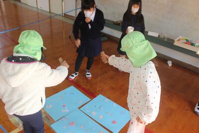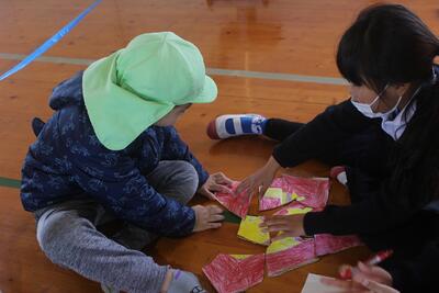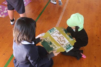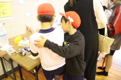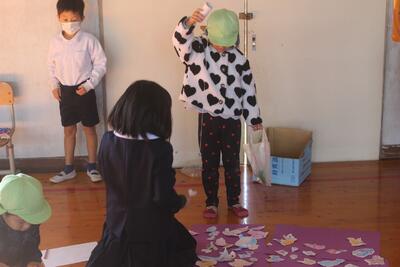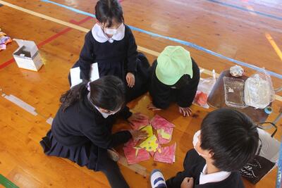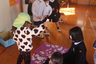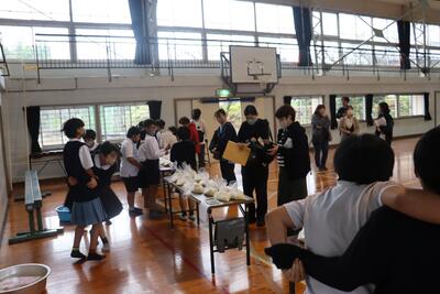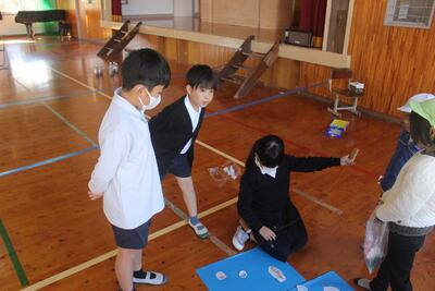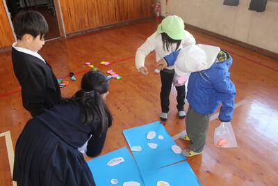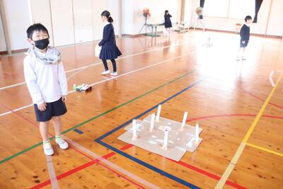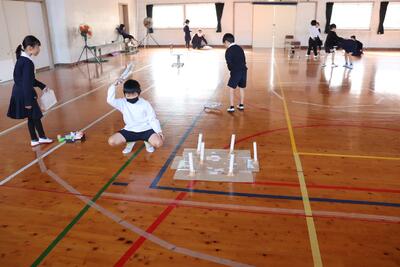 さて今日は、2年生が心を込めて準備した「おもちゃ祭り」が体育館で開かれました。近隣の保育園や幼稚園のみなさんをご招待!小さなお客さんたちがたくさん来てくれて、会場は笑顔と楽しさでいっぱいになりました。体育館には、手作りのおもちゃやゲームコーナーがずらり。魚釣りゲームやパズル、ボーリングなど、どれも2年生が工夫して作ったものばかりです。遊び方を説明したり、一緒に楽しんだりする姿は、とても頼もしく見えました。保育園・幼稚園のお友だちも、夢中になって遊んでくれていました。釣り竿を使って魚を釣るコーナーでは、「やった!」と声があがり、パズルコーナーではみんなで協力して完成させる場面も。2年生は「楽しんでもらえてうれしい!」と大満足の様子でした。今回のおもちゃ祭りを通して、2年生は「人に楽しんでもらうために工夫すること」「やさしく声をかけること」を学びました。小さなお客さんたちにとっても、楽しい思い出になったことでしょう!