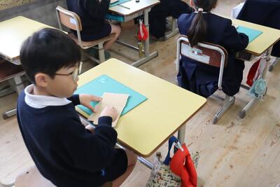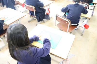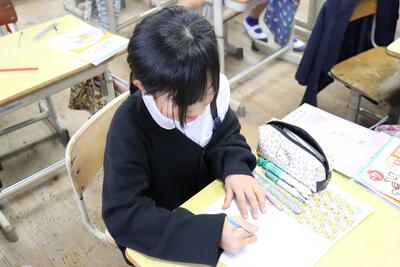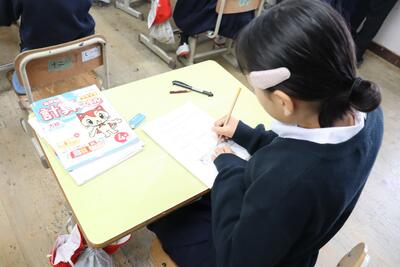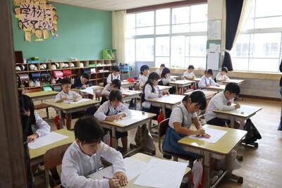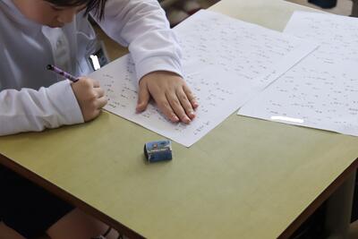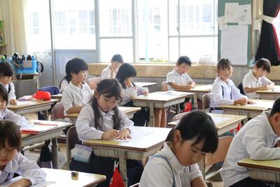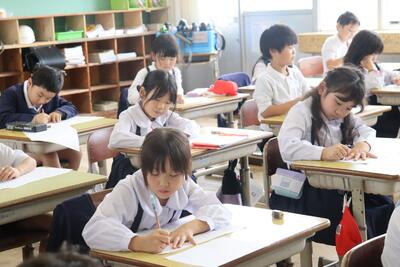 2年生の教室をのぞいてみました。みんな、漢字のプリントに取り組んでいるところ。教室はびっくりするくらい静かで、物音ひとつしないほどの集中力!鉛筆の音だけが聞こえていて、まるで図書館みたいでした。一人ひとりが真剣な表情で、丁寧に漢字を書いていて、見ているこちらまで背筋が伸びるような気持ちに。机の上にはプリントと消しゴムがきちんと並んでいて、それぞれのペースで黙々と進めていました。写真からも、そんな集中の空気が伝わってきます。この調子で、どんどん漢字マスターになっていってほしいですね!