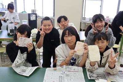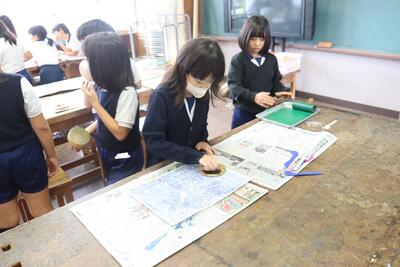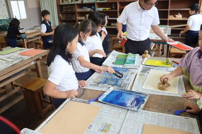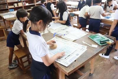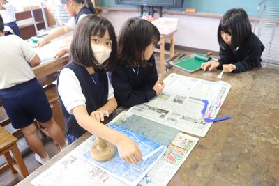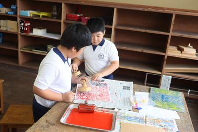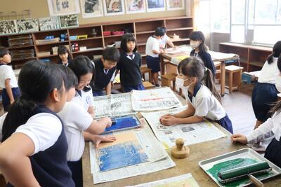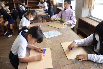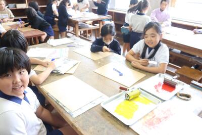 3年生は版画に挑戦!まずは、自分のデザインを彫るところからスタート。みんな真剣な表情で黙々と作業していました。そして、色とりどりのインクで印刷。青、赤、緑…カラフルなインクが教室に広がって、見ているだけでワクワクします。インクローラーで丁寧に塗って、紙にギュッと押し付けると…きれいな版画が完成!どの作品も個性たっぷりで、見ていて楽しくなるものばかり。集中して作業する姿も、笑顔で完成を喜ぶ姿も、とっても素敵でした。