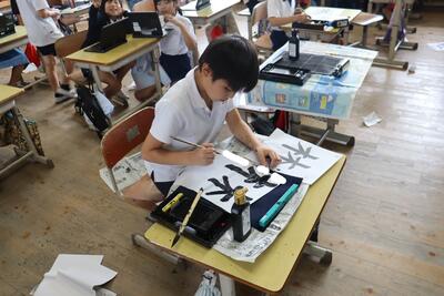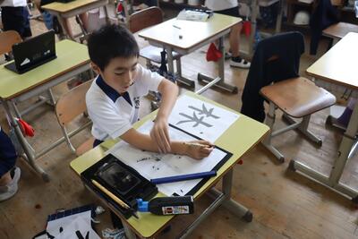 4年生が「認知症サポーター講座」を受けました。講師の方のお話を真剣に聞きながら、認知症についての理解を深める時間となりました。スクリーンを見つめる表情も真剣そのものでした。そして、習字の時間では「林」という字に挑戦!筆を持つ手にも力が入り、みんな集中して一画一画を丁寧に書いていました。机の上には新聞紙と書道道具が並び、教室には墨の香りがふんわり。完成した作品はどれも力強くて、個性が光っていました。