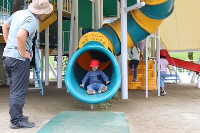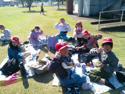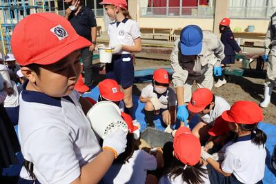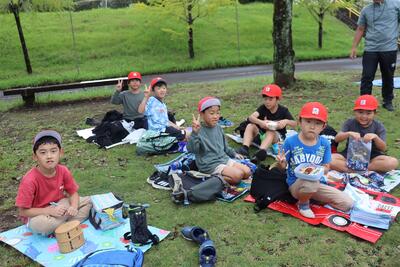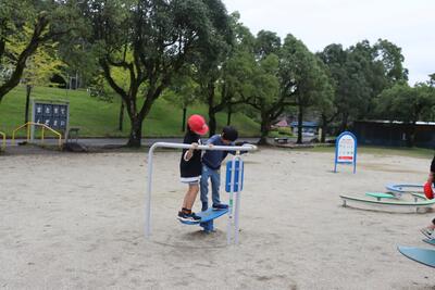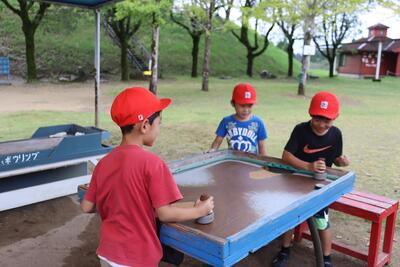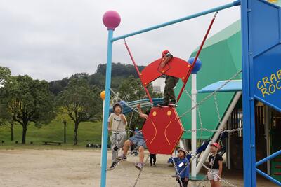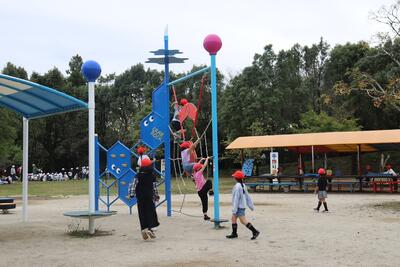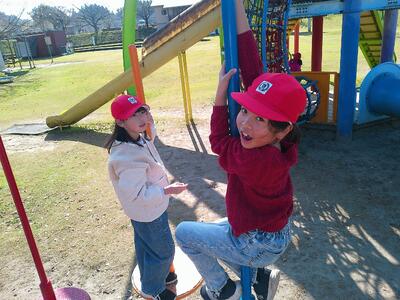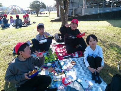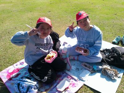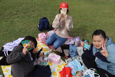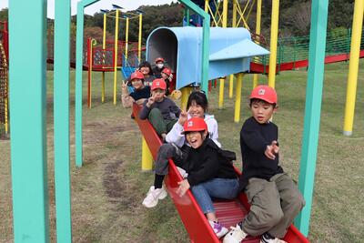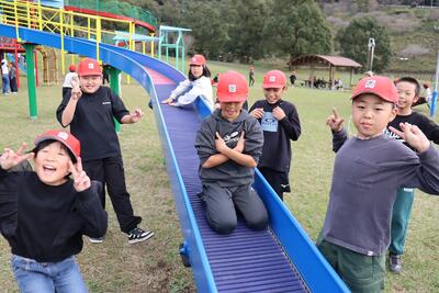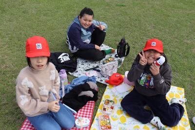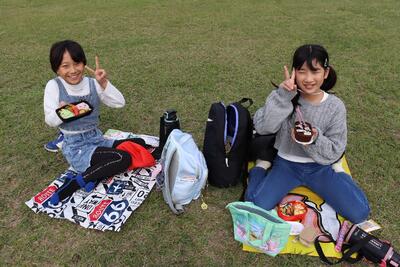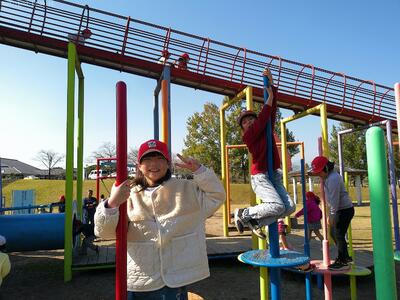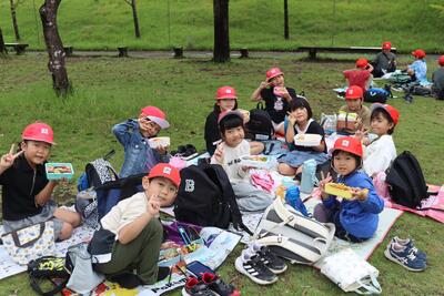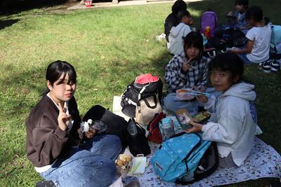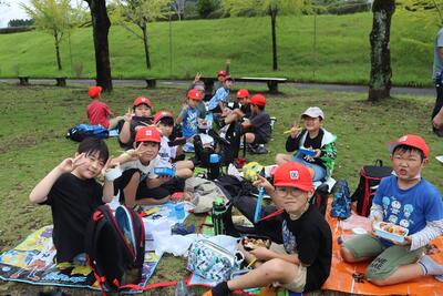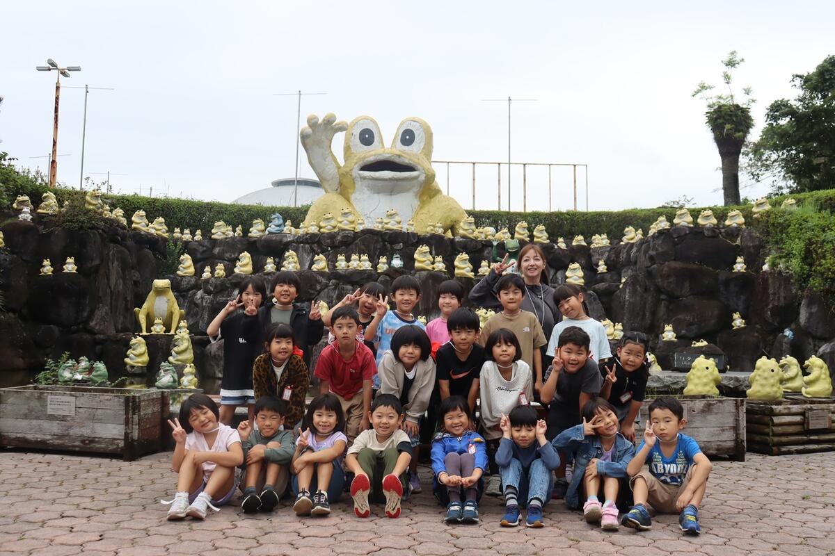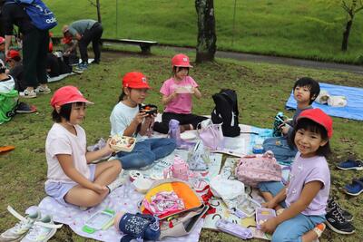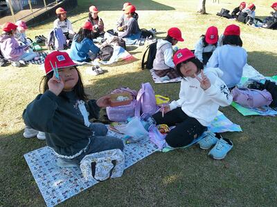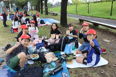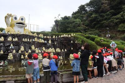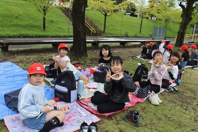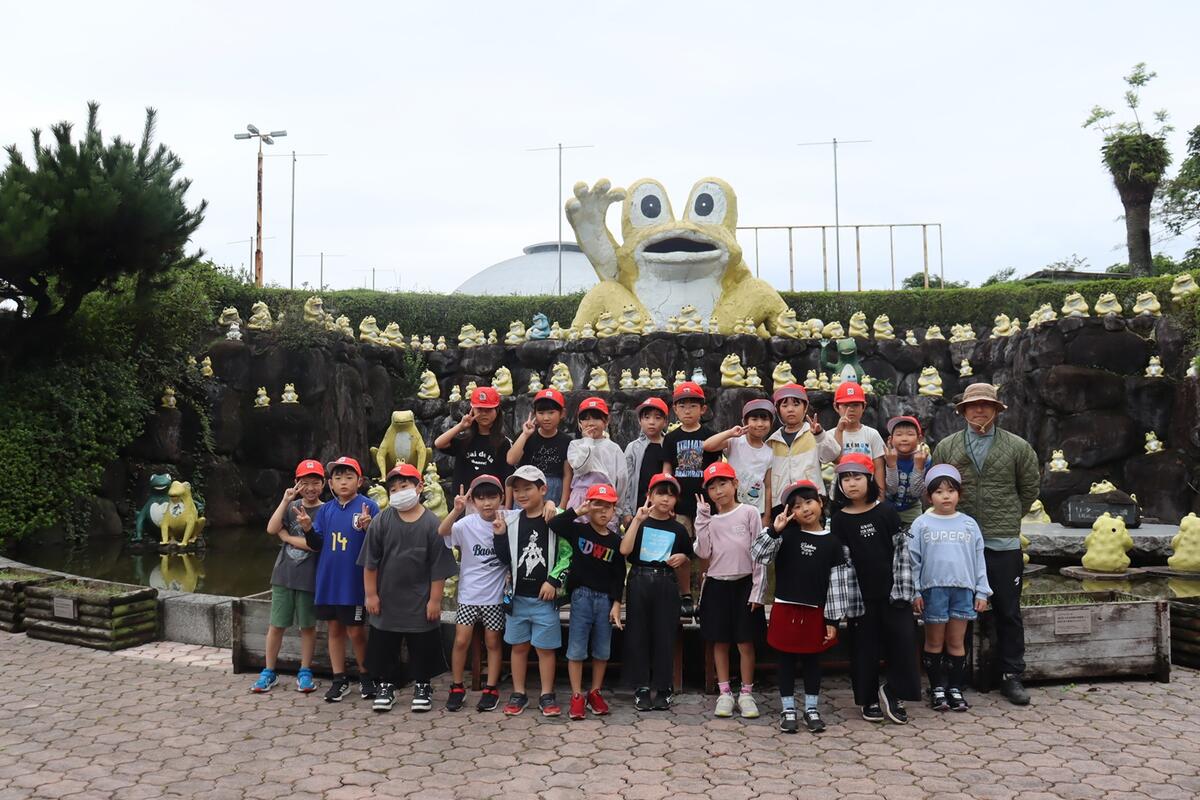 今日は1・2年生が楽しみにしていた「のじりこピア」への遠足の日。朝から空模様が心配でしたが…なんとかお天気ももってくれて、無事に出発することができました。現地では、子どもたちの元気な声が響き渡り、遊具で思いっきり遊ぶ姿がたくさん見られました。大きな滑り台や回転遊具、シーソーなど、どれも大人気!エアホッケーのようなゲームに夢中になる子もいて、笑顔があふれていました。お昼は、みんなでシートを広げてお弁当タイム。おうちの人が作ってくれたお弁当を、友達と一緒に食べる時間はとっても嬉しそうでした。「のじりこピア」のシンボル・大きなカエルの像の前で記念写真もパシャリ!みんなでポーズを決めて、素敵な思い出がまたひとつ増えました。