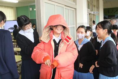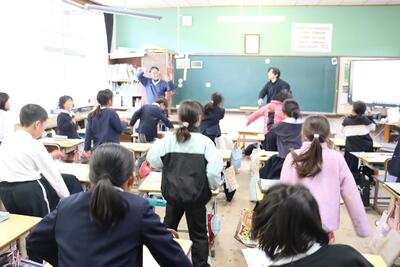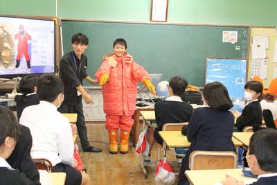 6年生は、出前講座「南極クラス」で特別な学びの時間を過ごしました。講師の先生から、南極での生活や観測の様子など、普段なかなか聞けないお話をたくさん聞かせていただき、子どもたちは興味津々!「えっ、そんなに寒いの!?」「ペンギンって本当にいるの?」と、目を輝かせながら聞き入っていました。実際に南極で使われている防寒着を着てみる体験もあり、「あったかい!」「思ったより軽い!」と、驚きの声があちこちから聞こえてきました。写真には、防寒着に身を包んでニコニコの子どもたちの姿がたくさん写っています。学びと発見がいっぱいの一日でした。