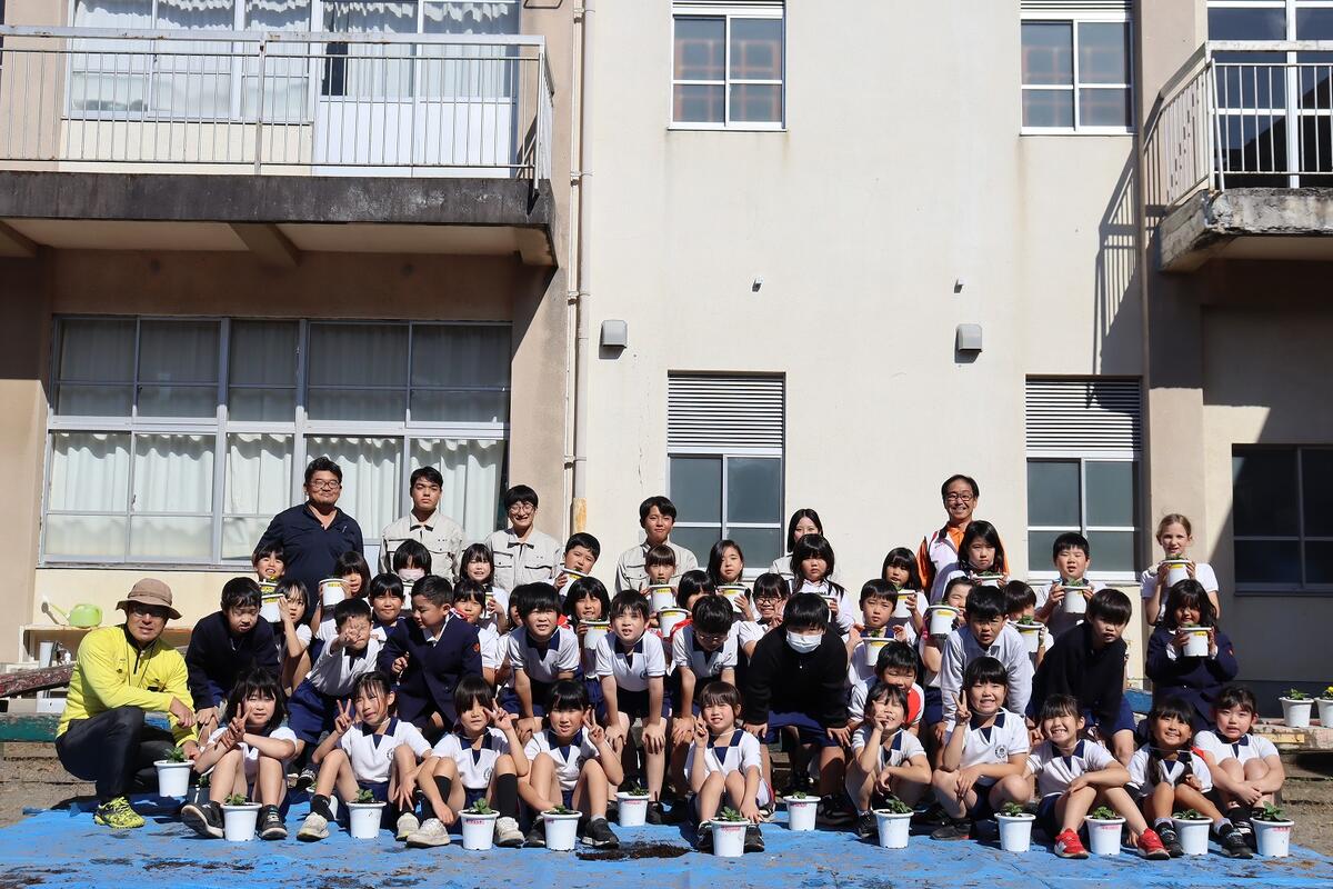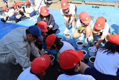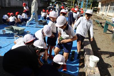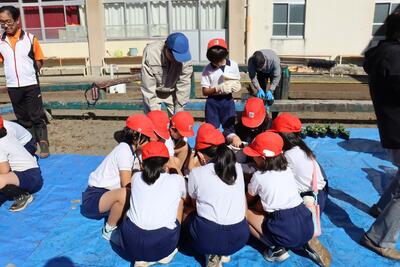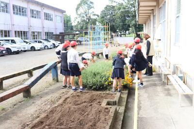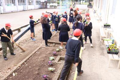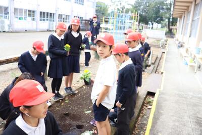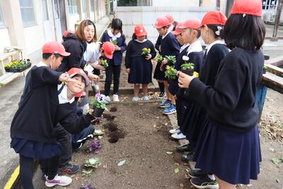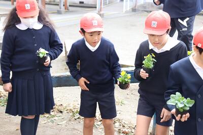 昨日届いた花の苗を、四年生のみんなが丁寧に植えてくれました。今日は少し肌寒い天気でしたが、子どもたちは赤い帽子をかぶり、協力しながら作業を進めます。土に穴をあけ、苗をそっと入れて、優しく土をかぶせる姿はとても頼もしいものでした。花壇には色とりどりの花が並び、これからの季節を明るく彩ってくれそうです。「きれいに咲くといいな」という気持ちを込めて、一生懸命植えた花たち。これからの成長が楽しみです!