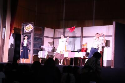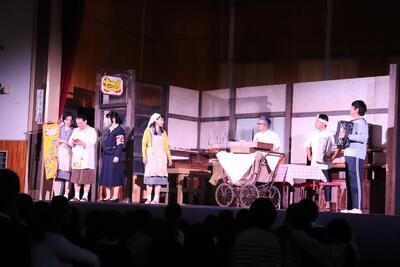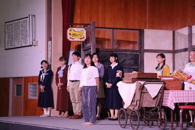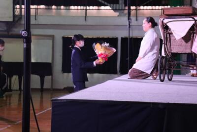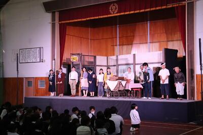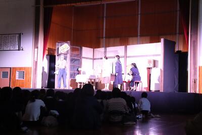 本日の鑑賞教室では、25馬力+こふく劇場による演目『小林三姉妹~幸せのパン種~』を鑑賞しました。舞台は昭和30年代初めの小林市。営業休止状態の小さなパン屋「タロのパン」を舞台に、父・清吉の病、戦争で亡くなった長女めぐみへの想い、そして母ハツエと三姉妹の絆が描かれます。当時の懐かしい歌謡曲を交えながら、家族や店を取り巻く人々の悲喜こもごもがユーモラスに、そして切なく表現され、観客は物語に引き込まれていきました。最後には大きな拍手とともに、花束贈呈や感謝の言葉が伝えられ、温かな雰囲気に包まれたひとときとなりました。