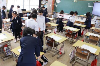 いよいよ明後日から6年生の修学旅行が始まります。今日は、その最終打ち合わせが行われました。行程や持ち物の確認をしながら、みんな真剣な表情で先生の話を聞いていました。楽しいだけでなく、学びの多い旅行にするための準備が着々と進んでいます。さらに、知覧特攻平和会館へ届ける千羽鶴の作成も進めています。廊下には色とりどりの折り鶴が並び、子どもたちは一羽一羽を丁寧に糸でつなげていました。「平和への願いを込めて」という思いが、折り鶴の鮮やかな色に表れています。完成した千羽鶴は、修学旅行でしっかりと届ける予定です。6年生にとって、小学校生活の大きな節目となる修学旅行。準備を通して、仲間と協力する大切さや、平和を願う心を改めて感じる時間となりました!
