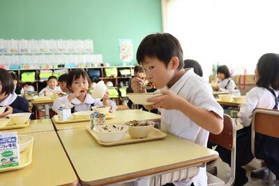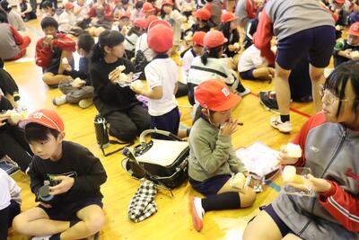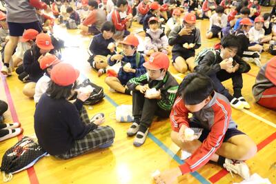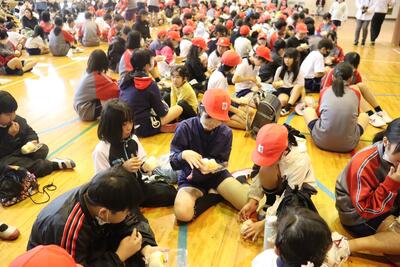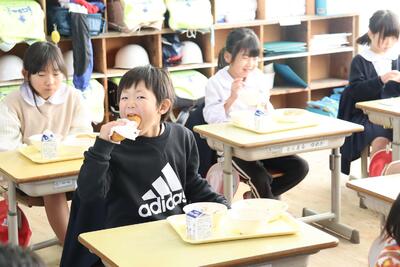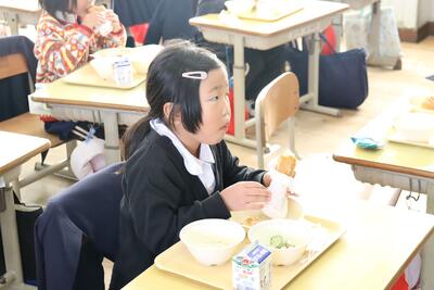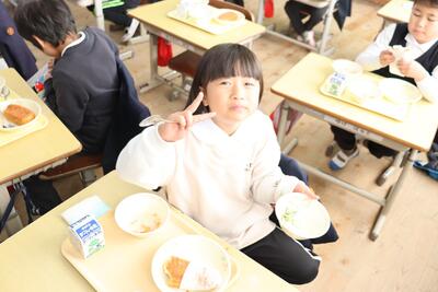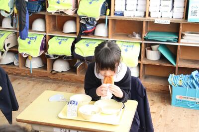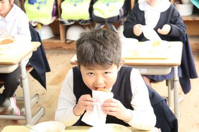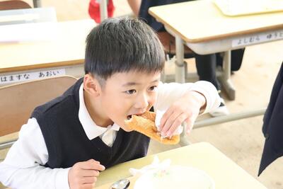 今日の給食は、西小林小のリクエスト給食。1年生にとって初めての揚げパンです。人気メニューの登場に、教室はちょっとしたお祭りムード!「わぁ!」「やった!」と声があがり、パンを両手でしっかり持ってかじる姿があちこちに。一口食べて「おいしい!」の笑顔が広がりました。すっかり揚げパンファンになったようです。