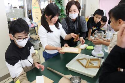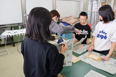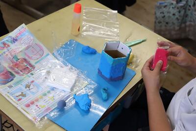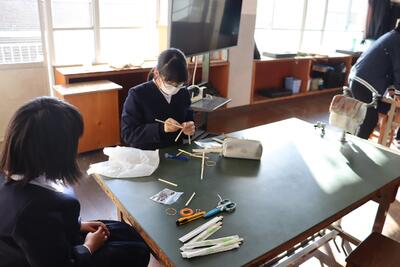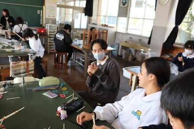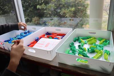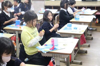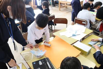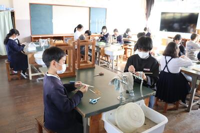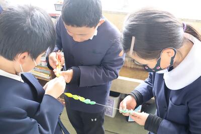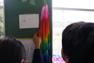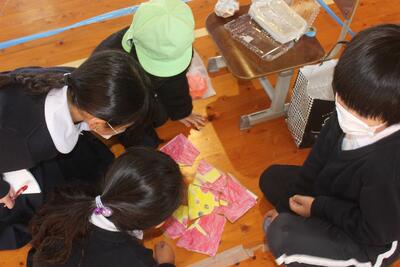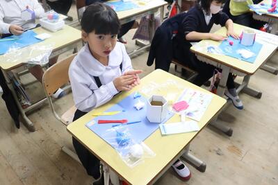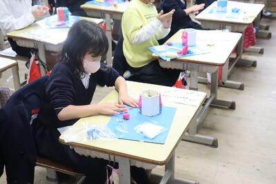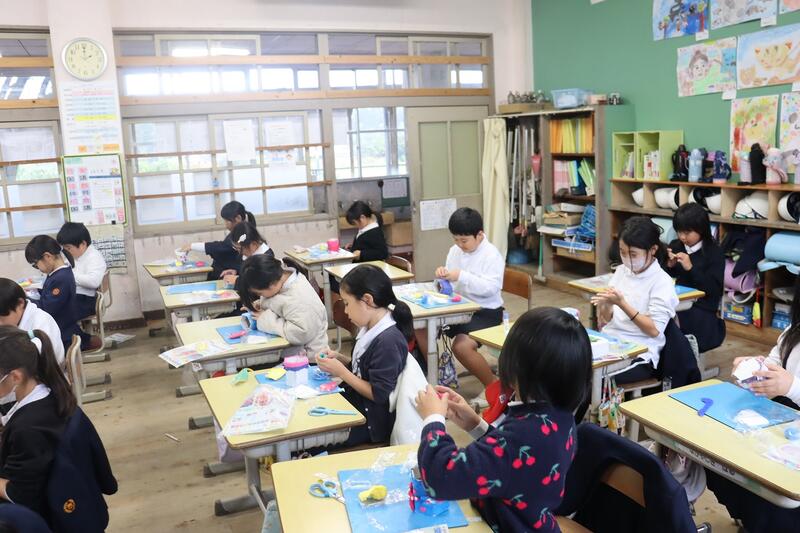 3年生の教室では青、ピンク、黄色…カラフルな色が教室いっぱいに広がって、とても楽しい雰囲気!「どんな模様にしようかな?」と考えながら、指先で丁寧に形を整える姿が印象的でした。