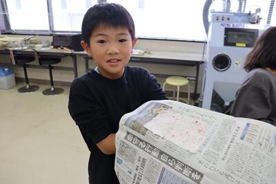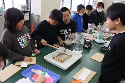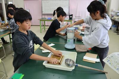 11月19日、4年生は待ちに待った遠足に出かけました。今回の目的は、自然や環境について学びながら、仲間と楽しい時間を過ごすことです。まず都城市リサイクルプラザ再生館を訪問しました。リサイクルやごみの分別について学べる施設です。説明を聞きながら、身近なごみの問題や資源の大切さについて理解を深めました。子どもたちは、真剣な表情で話を聞き、質問もたくさんしていました。次に体験したのは「紙漉き」。自分たちの手で紙を作る工程に挑戦しました。水に溶かした紙を型に流し込み、丁寧に形を整えていく作業は、みんな夢中になって取り組んでいました。「こんなふうに紙ができるんだ!」と驚きの声も。完成した紙は、世界に一つだけのオリジナル作品です。お昼は公園でお弁当タイム。芝生の上でシートを広げ、友達と一緒に食べるお弁当は格別です。おいしいお弁当を囲んで笑顔があふれ、食後は広い公園で元気いっぱい遊びました。