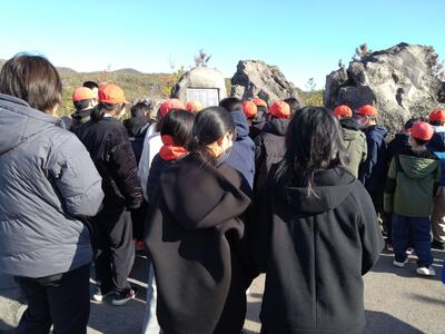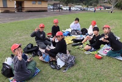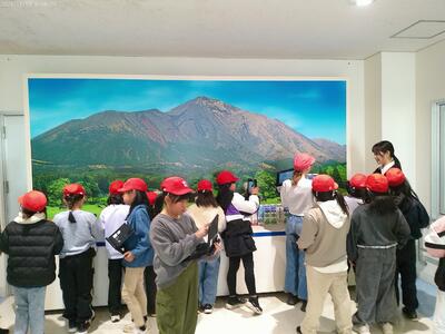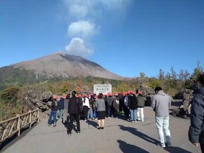 6年生 修学旅行スタート!今朝8時、6年生は元気いっぱいに学校を出発しました!最初の目的地は 有村溶岩展望所。到着すると、目の前には雄大な桜島がそびえ立ち、青空に向かって白い噴煙を上げています。「わぁ、すごい!」と子どもたちから歓声があがり、自然の迫力にみんな釘付け。奥に見えるのはもちろん桜島です。みんな笑顔で元気いっぱい。