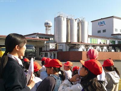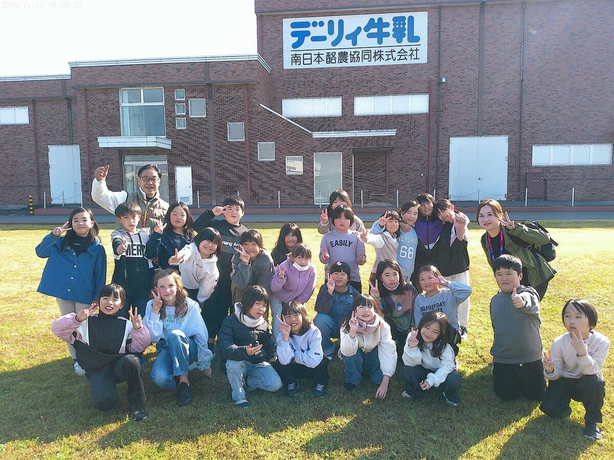 今日は3年生が楽しみにしていた デーリィ工場見学の日でした。工場に到着すると、まずは施設の方から説明を受け、いよいよ見学スタートです。工場の中では、商品がどのように作られているのかを間近で見ることができました。子どもたちはタブレットを使って写真を撮ったり、メモを取ったりしながら、真剣に学んでいました。大きな機械やタンクを見て「すごい!」と驚く声もたくさん聞こえました。見学の後は、広い公園に移動して お弁当タイム。青空の下でシートを広げ、友達と一緒に食べるお弁当は格別です!「おいしい!」と笑顔があふれ、食後は元気に遊びの時間。みんなで記念写真も撮って、楽しい一日となりました。工場の方々、ありがとうございました。今日学んだことを、これからの生活にも生かしていきたいですね。