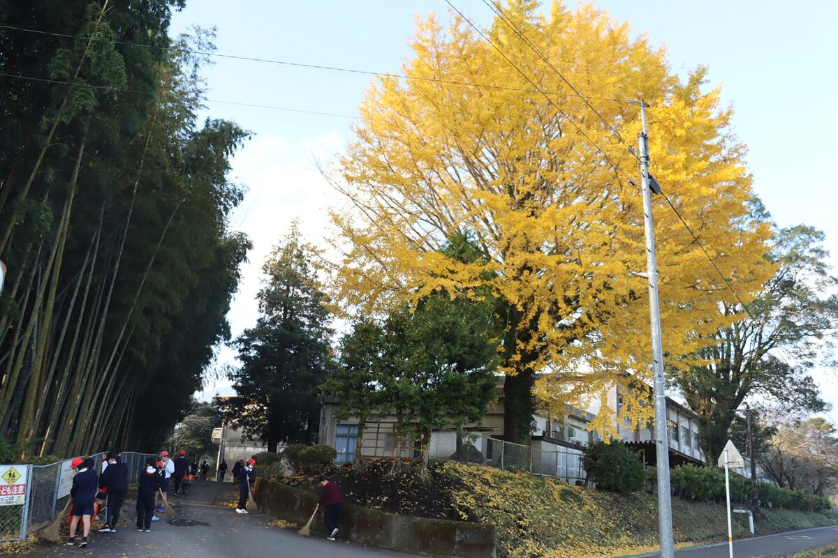 校門前のイチョウが、見事な黄金色に染まりました。青空に映える大きな木は、まるで季節の移り変わりを告げるシンボルのようです。足元にはたくさんの落ち葉が広がり、まるで黄色いじゅうたんを敷き詰めたような光景になっていました。今日は、その落ち葉をみんなで協力して清掃しました。ほうきやちりとりを手に、道路や歩道に積もった葉を集める作業はなかなか大変でしたが、力を合わせるとあっという間にきれいになりました。作業後の道はすっきりと整い、イチョウの美しさがさらに際立っています。