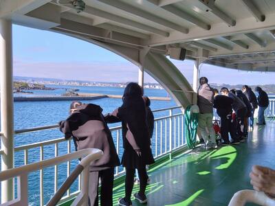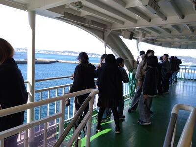 有村溶岩展望所を後にして、次の目的地は鹿児島市です。子どもたちはフェリーに乗り込み、海風を感じながらデッキで景色を楽しんでいます。青い海の向こうに広がる街並みを眺めながら、「もうすぐ鹿児島市だ!」とわくわくした様子。船の上から見る景色は、陸から見るのとはまた違った魅力があります。修学旅行ならではの体験を、みんなでしっかり味わっています。この後は、鹿児島市で食事をした後自主研修が待っています!